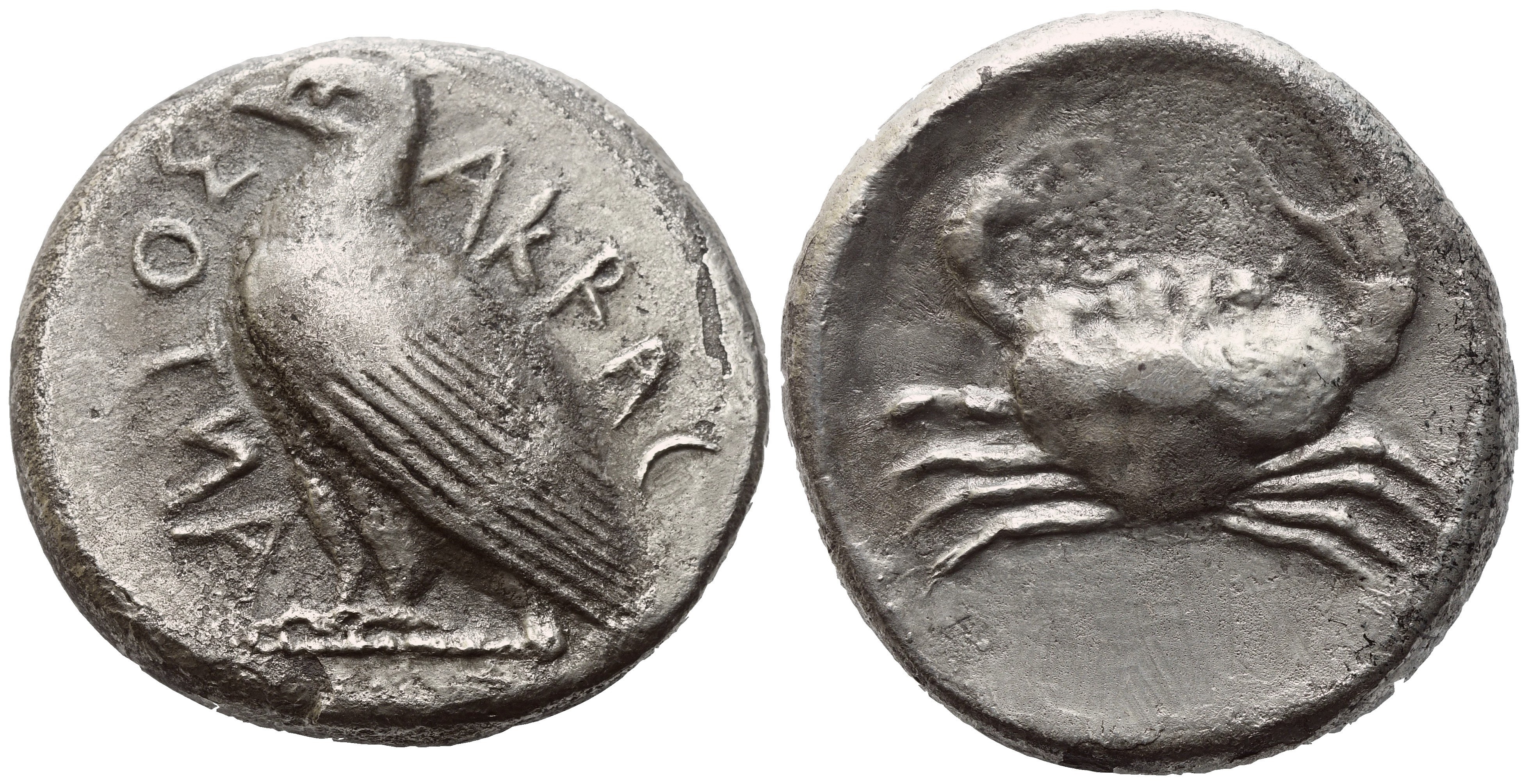 AKPAC-ANTOΣ (retr.) Eagle standing l., with closed wings, Rv. Crab within incuse square. SNG Copenhagen 41 SNG ANS 976-978. Pleasing cabinet tone. Good very fine.