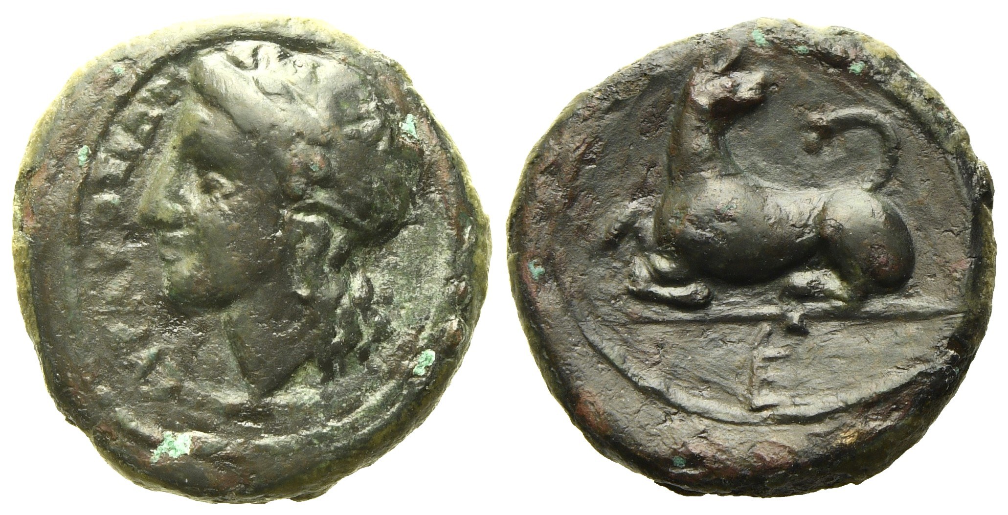 ΣYPAKOΣΙΩN, head of Apollo l.; Rv. Dog lying l., head r. towards a snake; monogram in exergue. SNG ANS 745; Calciati, 149R1/7. Dark brown-green patina. Good very fine.