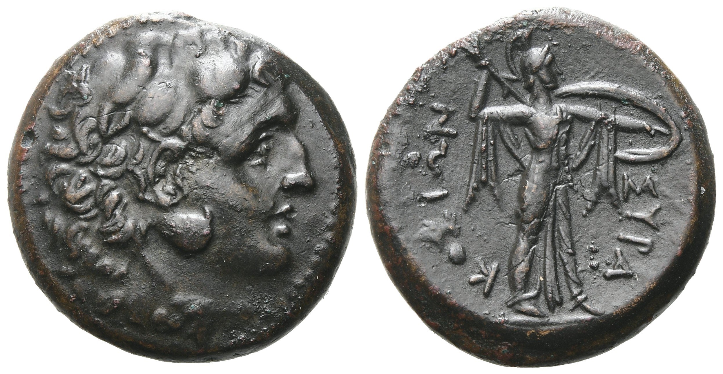 Head of Herakles r., wearing lion's skin. R/ Athena Promachos standing r., holding shield and thunderbolt. CNS II, 182; HGC 2, 1452. Dark patina. Good very fine.
