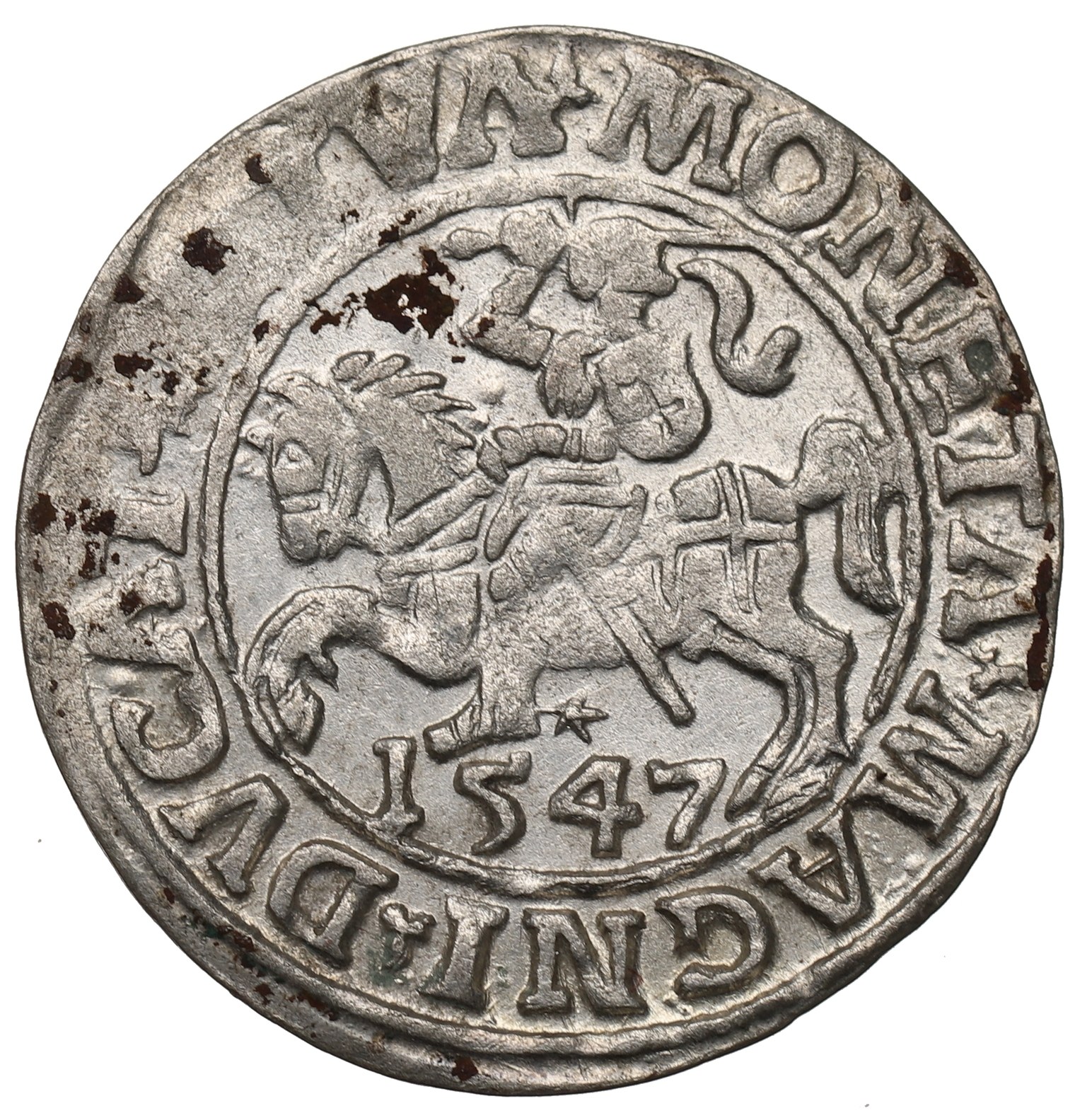Rewers: w otoku sznurowym Pogoń w lewo, pod nią data 1547, w otoku zewnętrznym legenda przedzielona trójlistkami: