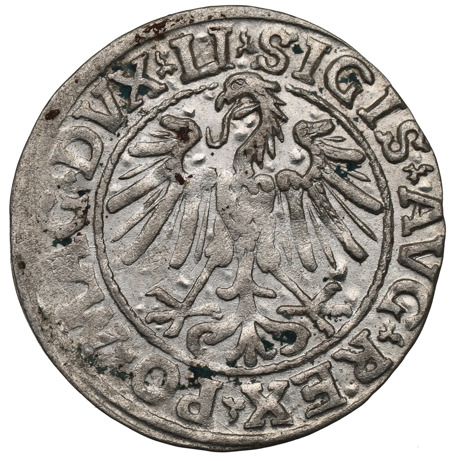Awers: w otoku sznurowym orzeł o wąskim korpusie, z głową heraldycznie w prawo, z rozłożystym ogonem, o czteroszponiastych łapach, w otoku zewnętrznym legenda przedzielona trójlistkami: SIGIS AVG REX PO MAG DVX LI;