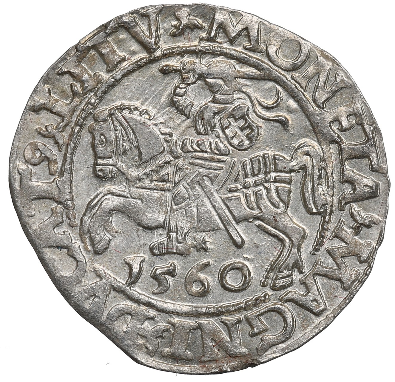 Rewers: w otoku perełkowym Pogoń w lewo, pod nią data 1560, w otoku zewnętrznym legenda przedzielona trójlistkami: