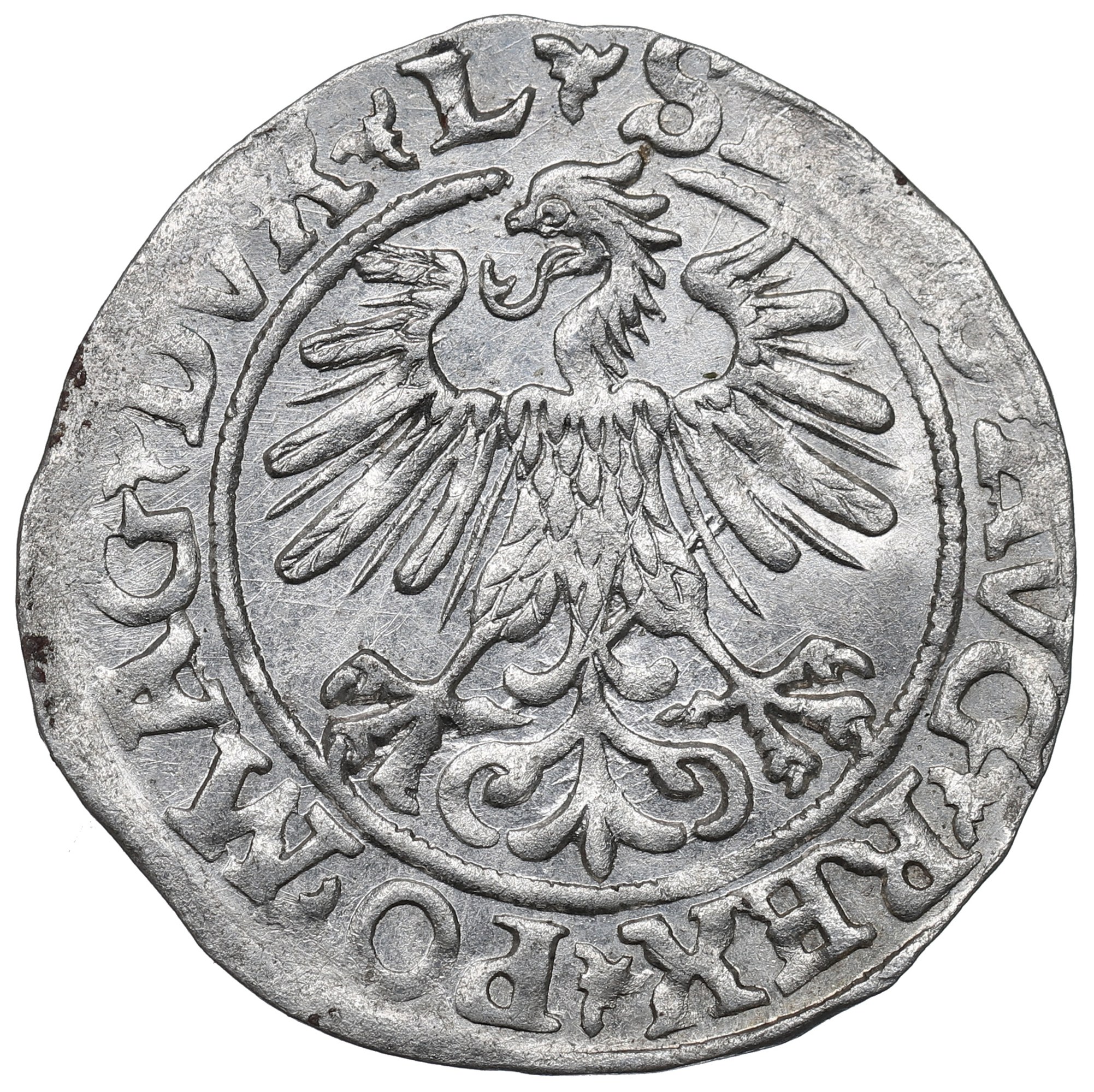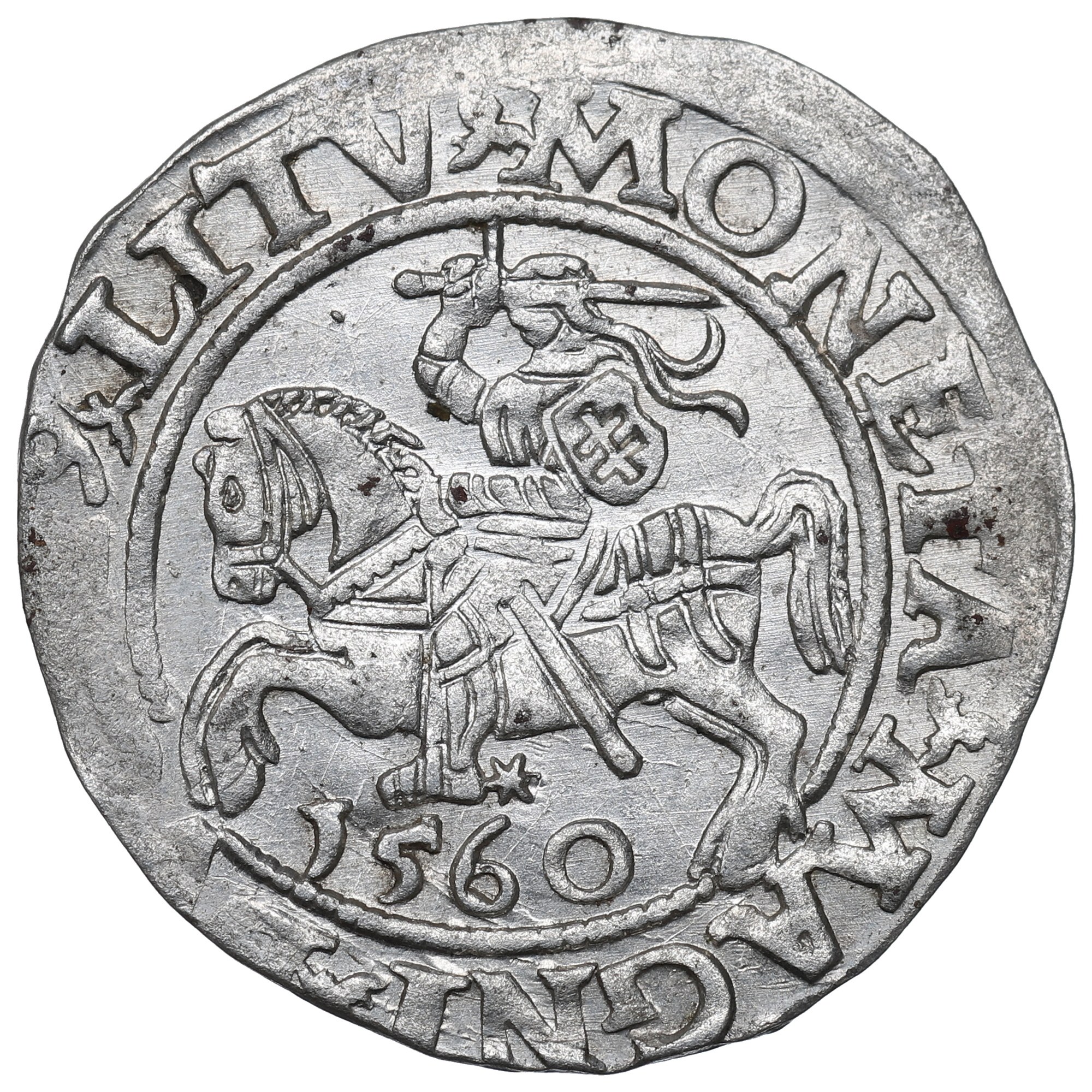Rewers: w otoku perełkowym Pogoń w lewo, pod nią data 1560, w otoku zewnętrznym legenda przedzielona trójlistkami: