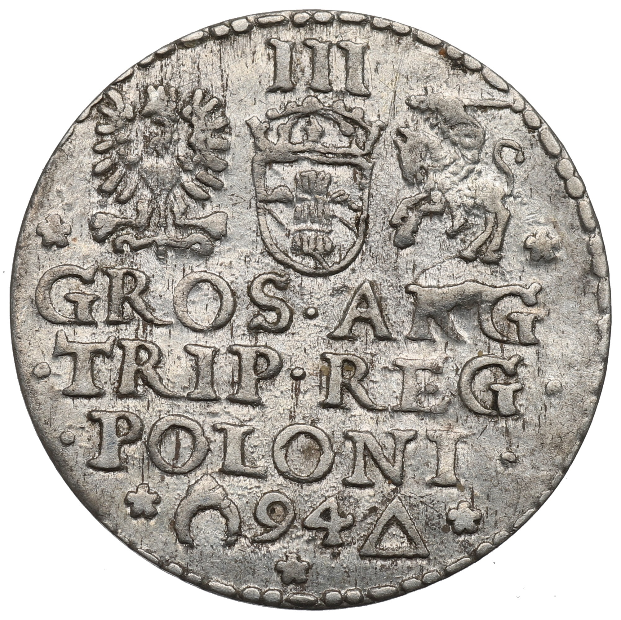 GROS•ARG/•TRIP•REG•/•POLONI•, pod nią skrót daty 94 i znaki mennicze pierścień i trójkąt mincerzy Goebla i Gonzalo między ozdobnikami;