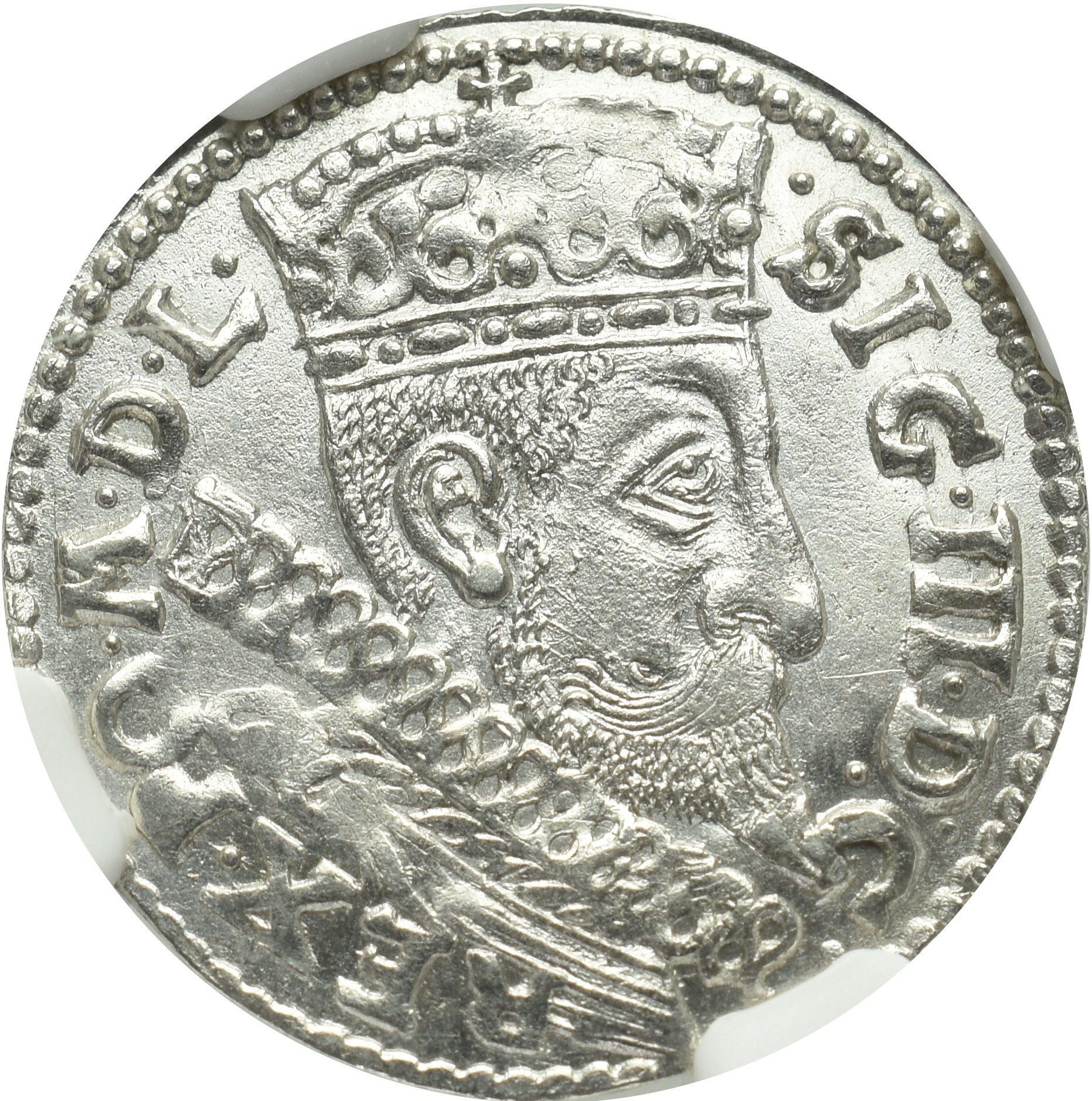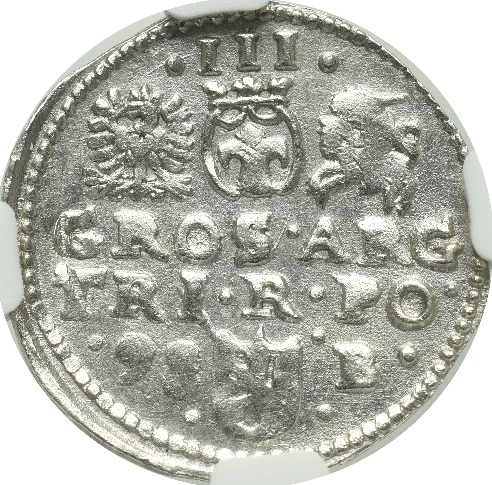 Rewers: oznaczenie nominału •III•, pod nim herby Orzeł - Korony Królestwa Polskiego, Snop - dynastii Wazów i Pogoń - Wielkiego Księstwa Litewskiego, niżej legenda w dwóch wierszach: