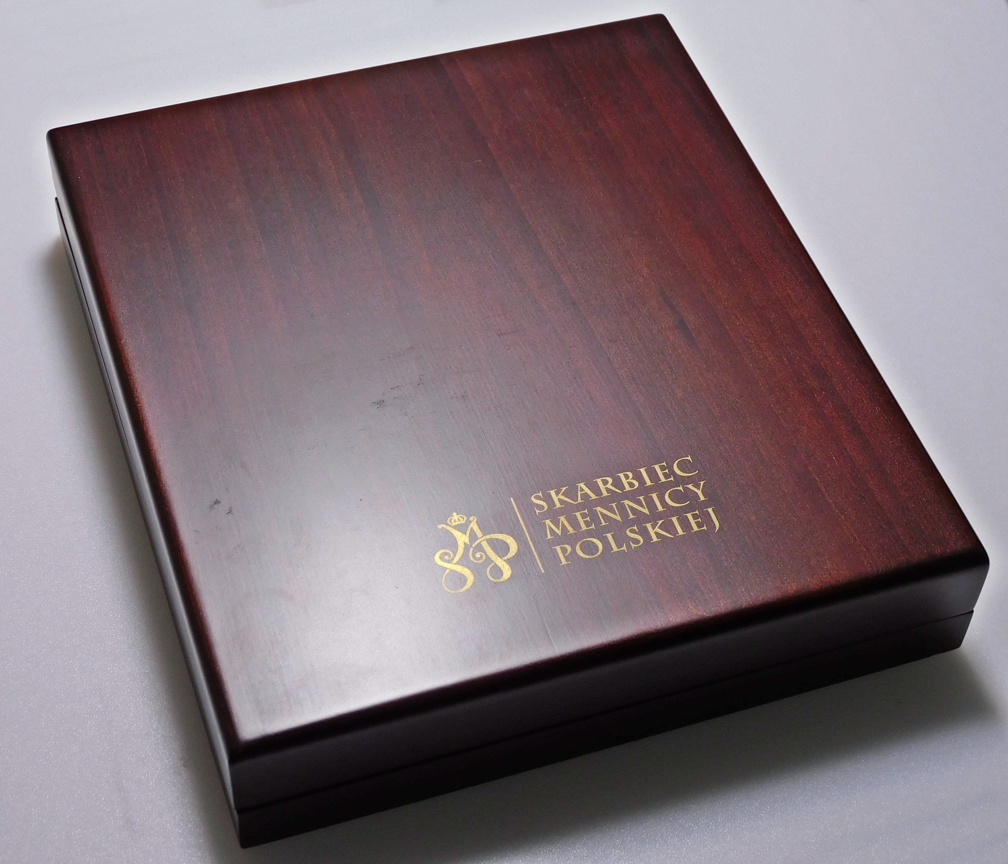 Zestaw składa się z: 2 sztuki numizmatów + 1 sztuka moneta 10 zł + oryginalne pudełko drewniane + certyfikaty + pudełko tekturowe