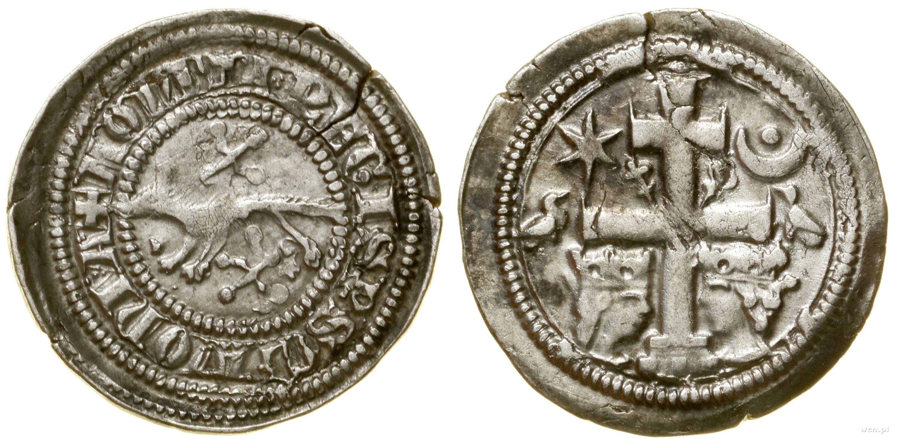 Aw: Kuna w lewo między dwiema gwiazdkami, + MONETA REGIS P SCLAVONIA, Rw: Krzyż, w którego kątach gwiazda, półksiężyc i dwie ukoronowane głowy, skierowane ku sobie, po bokach dwa ptaki skierowane do siebie