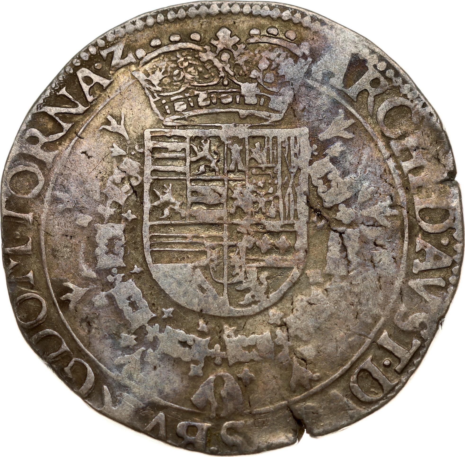 Spanish Netherlands TOURNAI 1 Patagon (1612-21). Albert & Isabella (1612-1621). Obverse: St. Andrew's cross; crown above; fleece below; divides pair of crowned monograms. Reverse: Crowned shield in fleece collar. Reverse Legend: …DVCES BVRG DOM TORN(Z). Silver. Damaged coin. KM 31