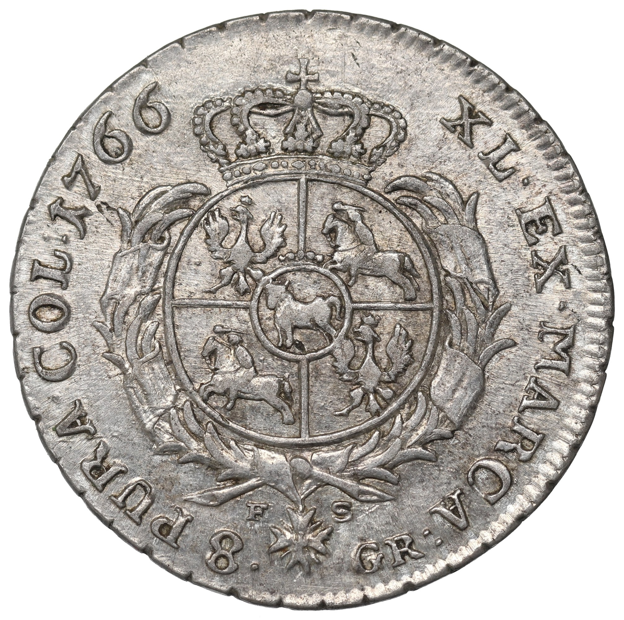 Rewers: ukoronowana pięciopolowa tarcza herbowa z herbami Korony, Wielkiego Księstwa Litewskiego i herbem Ciołek Poniatowskich, w wieńcu palmowym opasanym wstęgą z Orderem Orła Białego; pod nim, rozdzielone Orderem inicjały F-S (Fryderyka Sylmy mincmistrza warszawskiego) i nominał 8-GR, w otoku legenda: