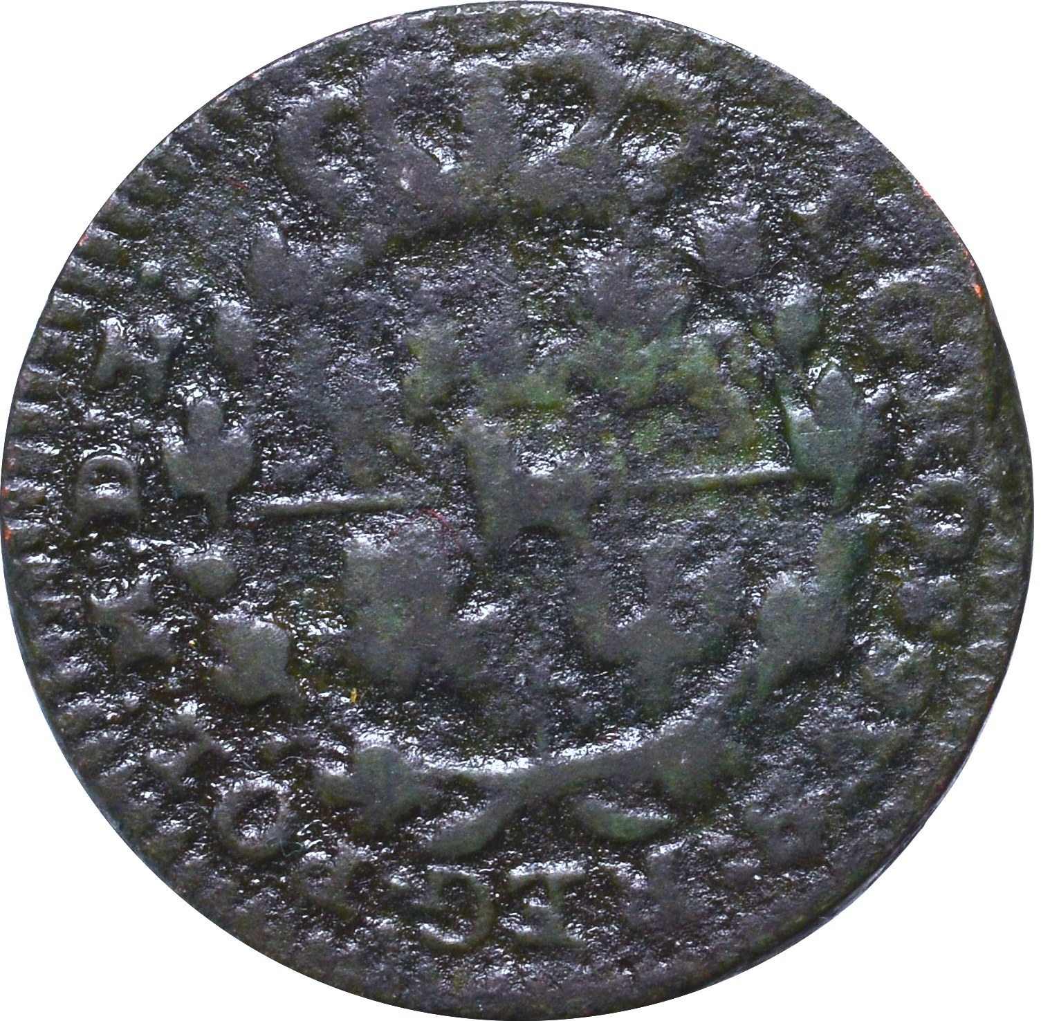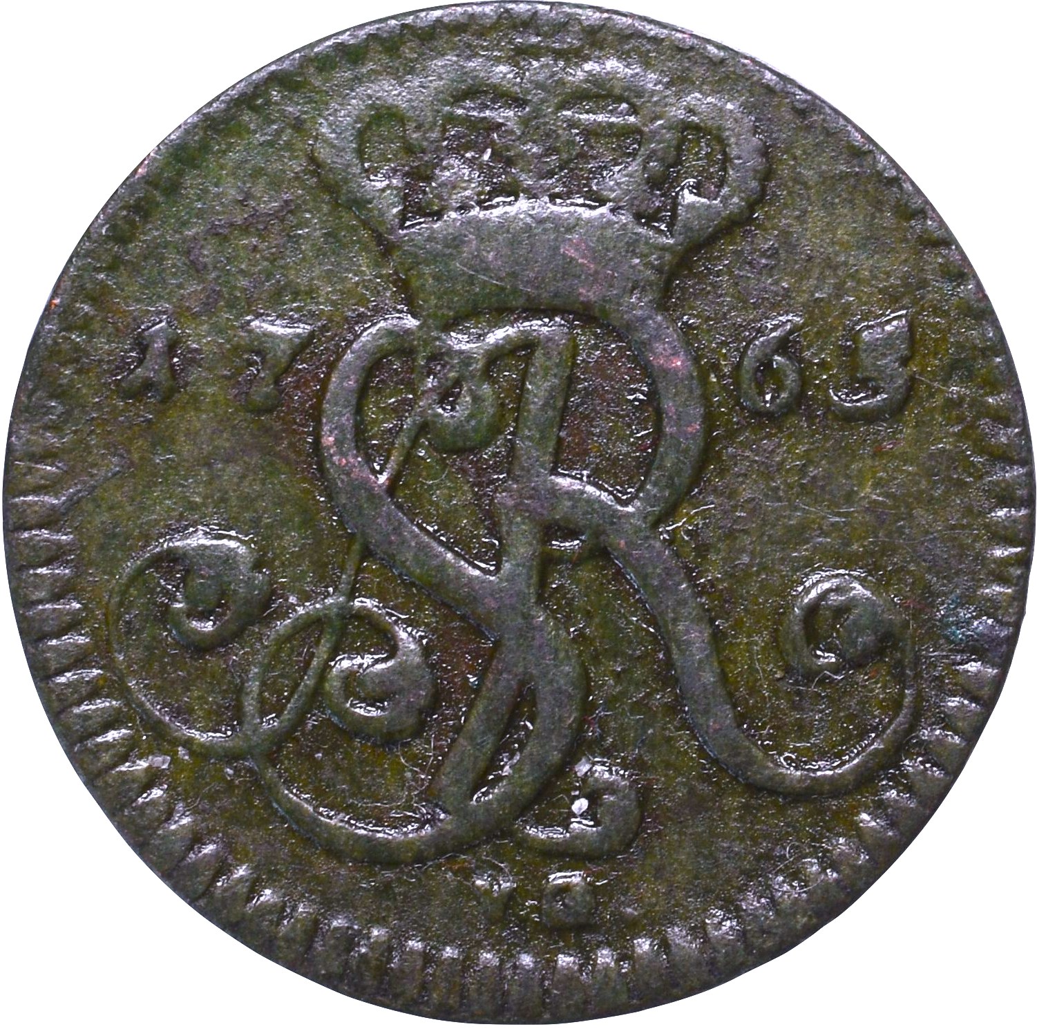 Obiegowy egzemplarz w ciemnozielonej patynie.