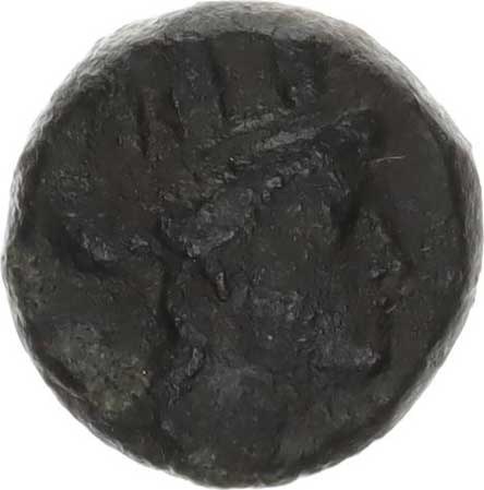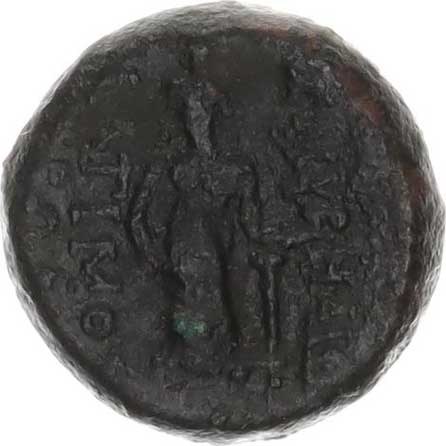 Starověké Řecko, AE 16, Hlava bohyně Tyché zprava / stojící bohyně u sloupu