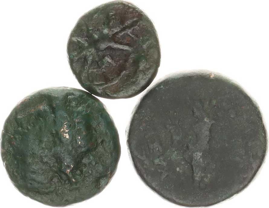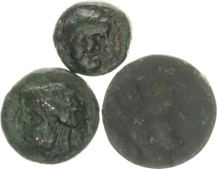 Konvolut 3 ks: AE 12 - Vousatá hlava / ještěrka AE 14 - Mužská hlava / ženská hlava; +AE 17 - hlava Tyché s hrad ební korunou / stoj. postava drží Niké