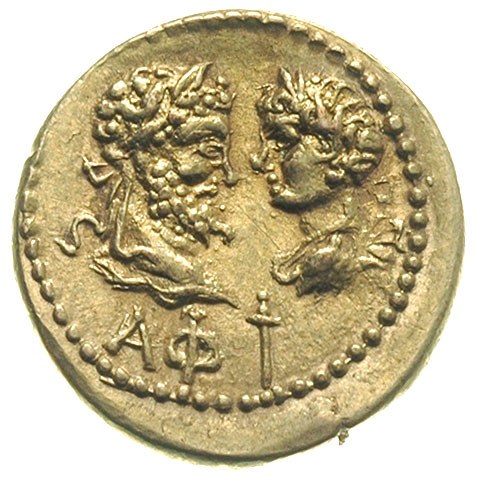 Królestwo Bosporu, Sauromates II 174-210, stater 204 pne, Aw: Popiersie króla w prawo, wokoło BACIΛΕΩC CAYPOMATOY, Rw: Popiersia Septymiusza Sewera i Karakali zwrócone do siebie, poniżej ΑΦ i miecz, elektron 7.79 g, SNG Cop. 65, BMC XIII/68/13, Stanisławski 451, piękny egzemplarz