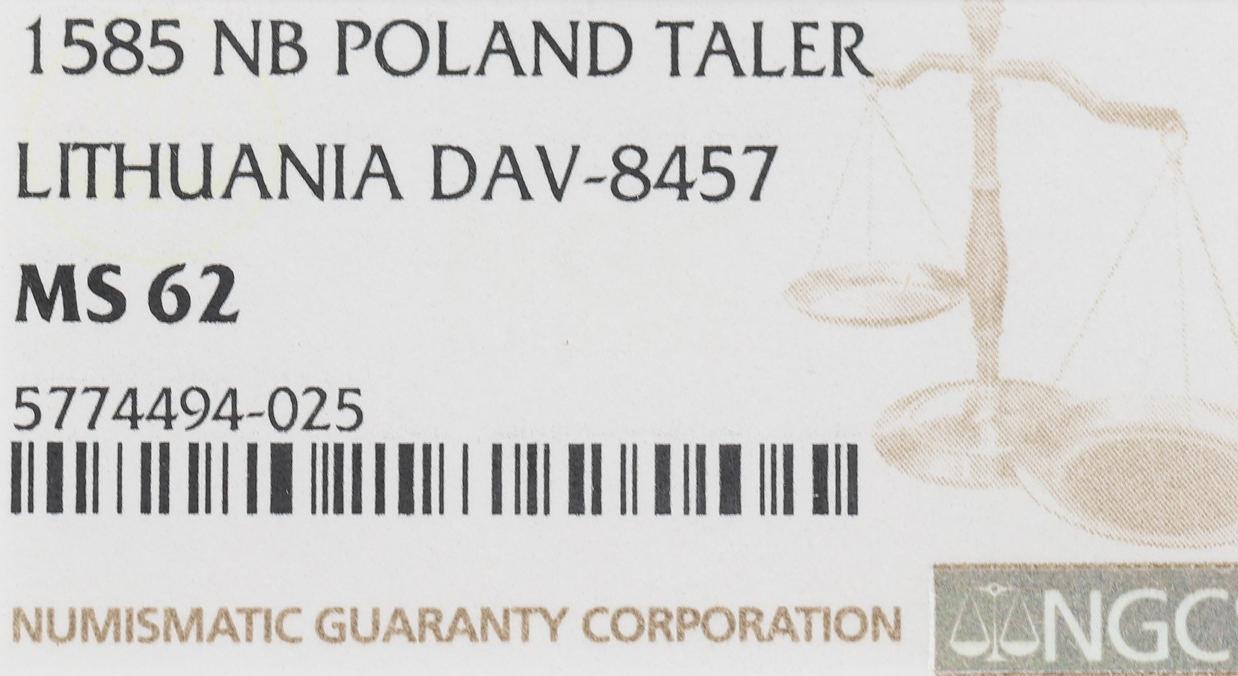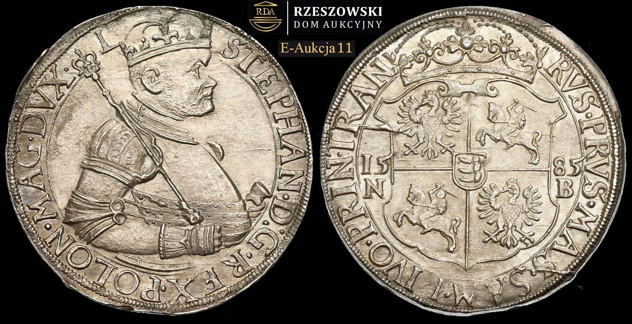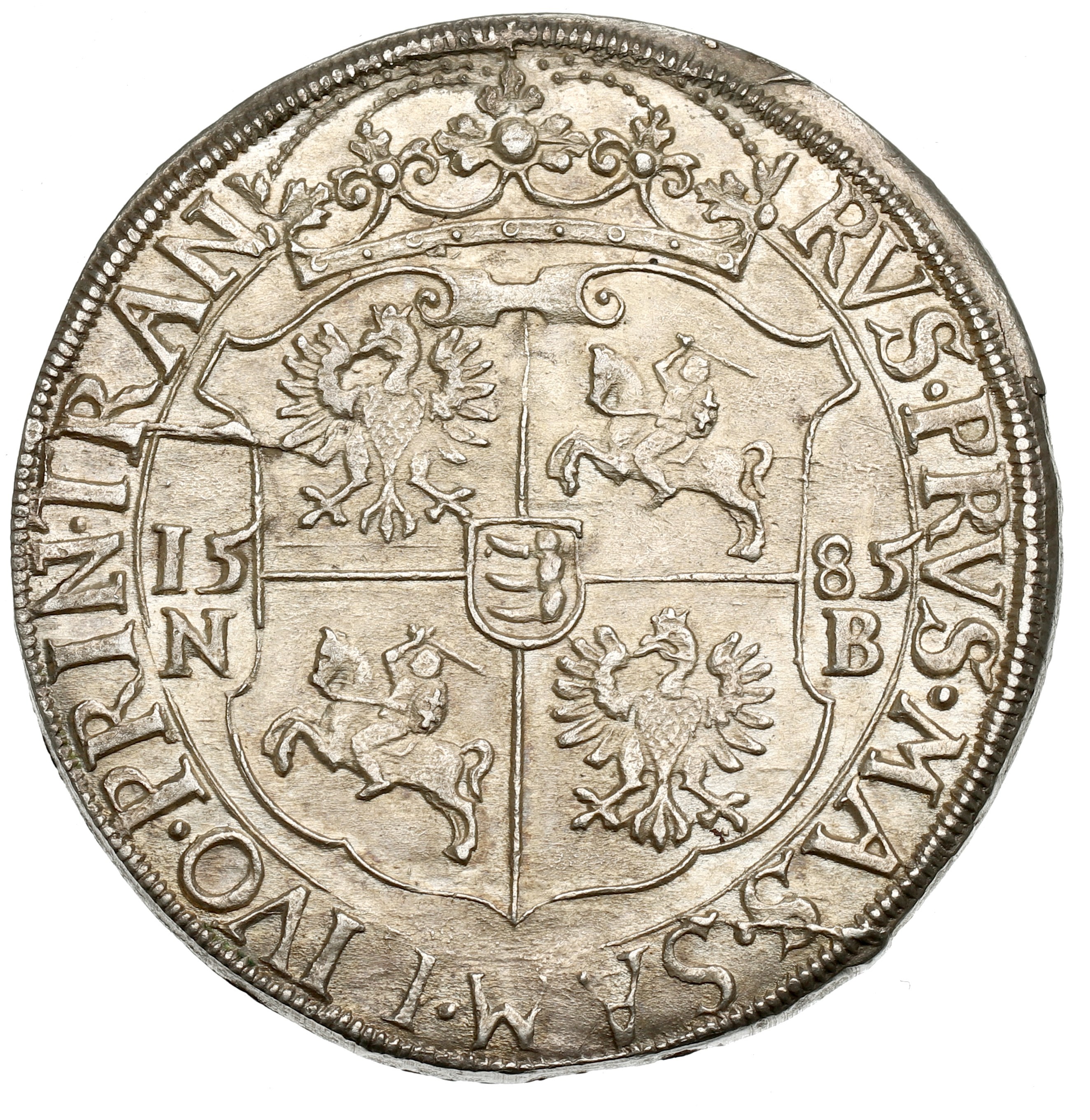 Rewers: w otoku liniowym, przedzielonym u góry koroną pięciokabłąkową, z reflowymi fleuronami, o 9 klejnotach w obręczy, tarcza herbowa typu polskiego z herbami Korony Królestwa Polskiego, Wielkiego Księstwa Litewskiego i herbem Smocze Zęby rodu Batorych; po bokach tarczy data 15-85 oraz inicjały N-B (Nagy-Banya); w otoku zewnętrznym legenda: