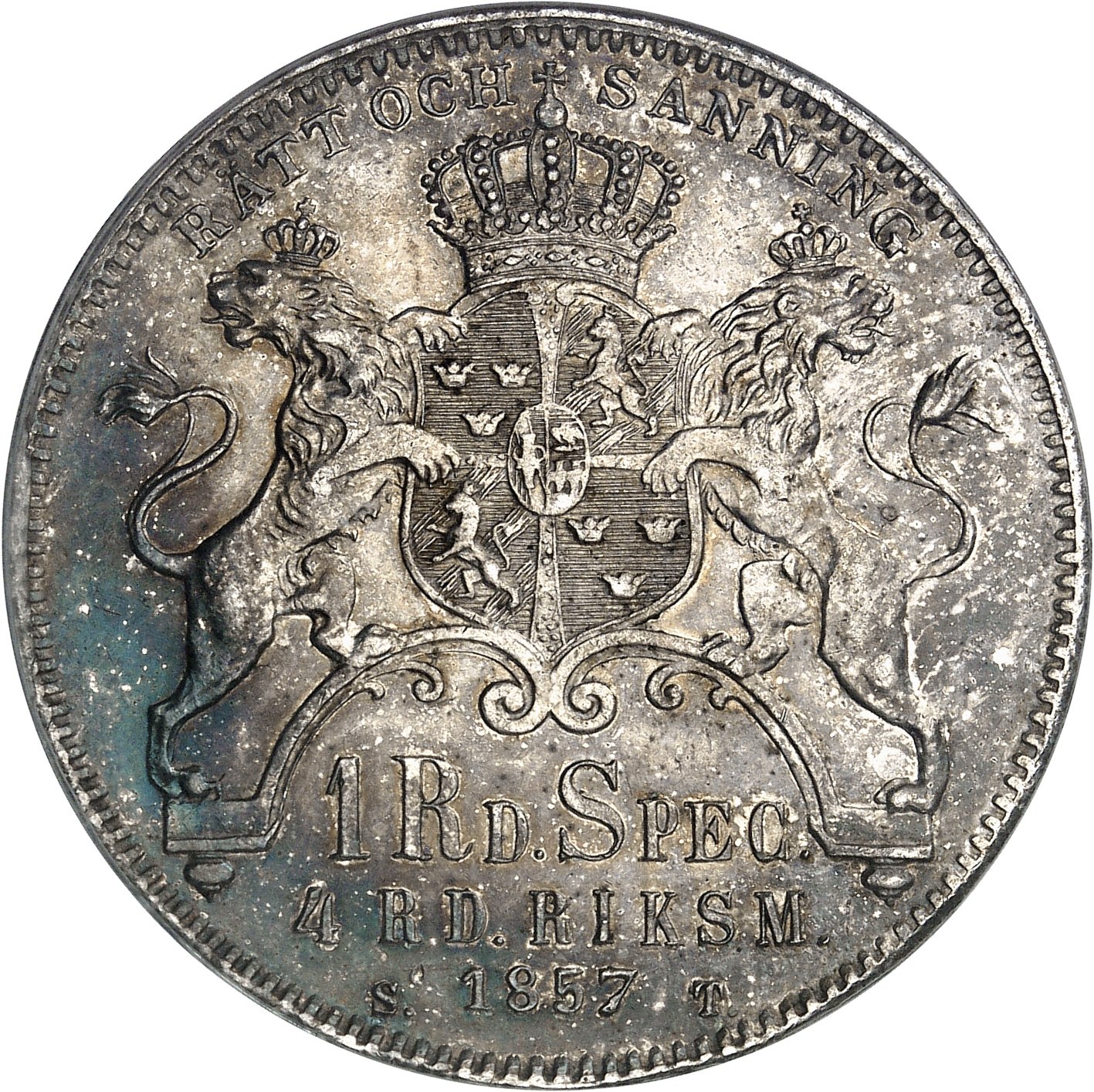 Oscar Ier (1844-1859). 1 riksdaler specie ou 4 riksdaler Ryksmint, 2e buste à barbe longue et grand 4 1857 ST, Stockholm. PCGS Genuine Altered Surf.-AU Detail (50544844).