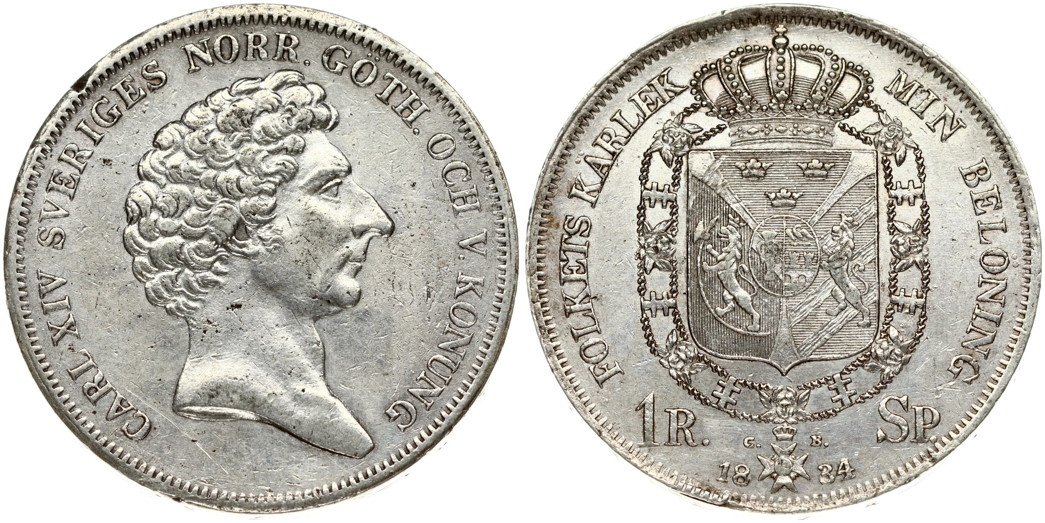 Sweden 1 Riksdaler 1834 CB Carl XIV Johan(1818-1844 ). Obverse: Head right. Obverse Legend: CARL XIV SVERIGES.....
