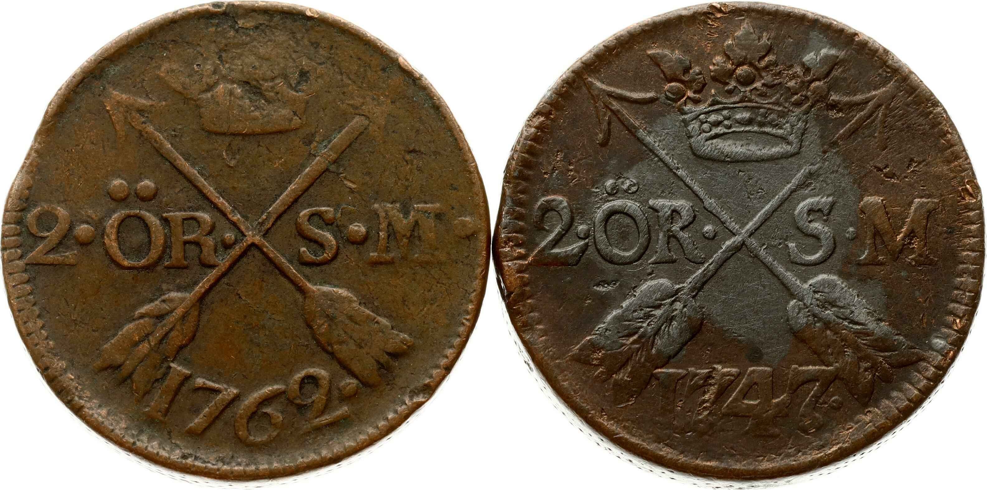 Sweden 2 Ore 1747 & 1762 Lot of 2 Coins