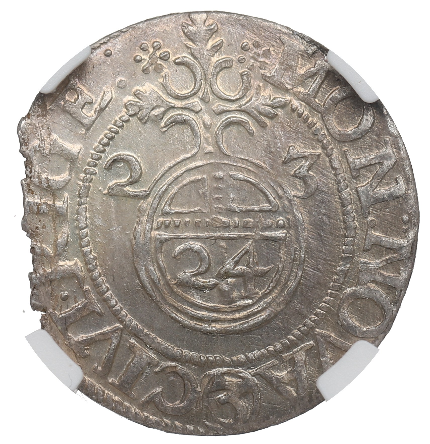Rewers: w otoku perełkowym jabłko królewskie z wpisanym weń oznaczeniem nominału 24, po bokach jabłka skrót daty 2-3, w otoku zewnętrznym legenda: