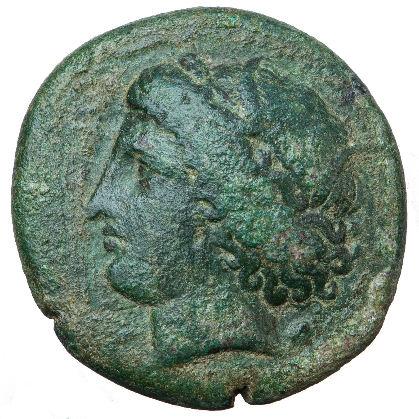 Av. Głowa Kory-Persefony w wieńcu z kłosów w lewo, za głową symbol - muszla ?. [ΣΥΡΑΚΟΣΙΩΝ] przed twarzą;