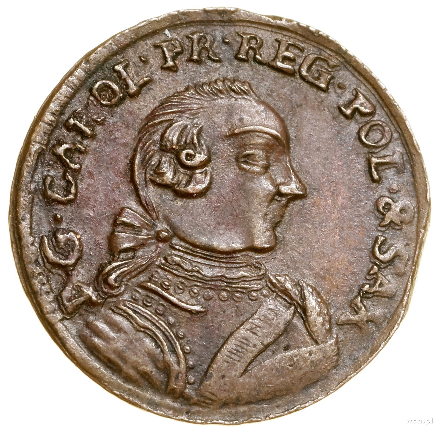 Karol Krystian Saski (1758–1763), Szeląg, 1762, Mitawa; odmiana z napisem POL na awersie; Haljak 1719, K.-G. 5.1.1.3, Kop. 4077 (R3); pięknie zachowany.
