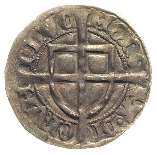 Michał Küchmeister von Sternberg 1414-1422, szeląg, Aw: Tarcza Wielkiego Mistrza, MAGS-T MIC-hAEL PRIM, Rw: Tarcza zakonna, MONE-TA DN-ORVM PRVC, Voss. typ IX, bardzo ładny, patyna