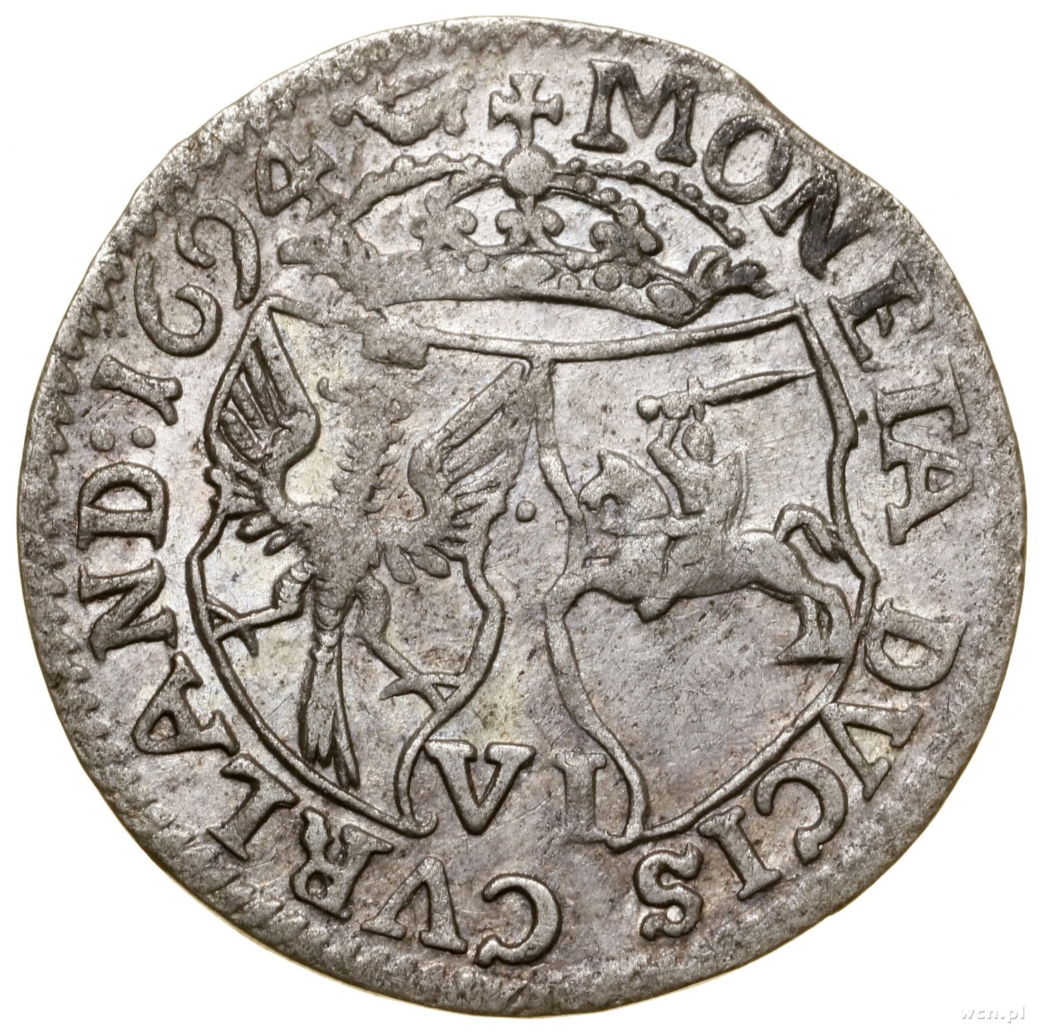 Fryderyk Kazimierz Kettler (1682–1698), Szóstak, 1694, Mitawa; Haljak 1702a, K.-G. 4.7.1.1, Kop. 4071 (R4); bardzo ładnie zachowany i rzadki.