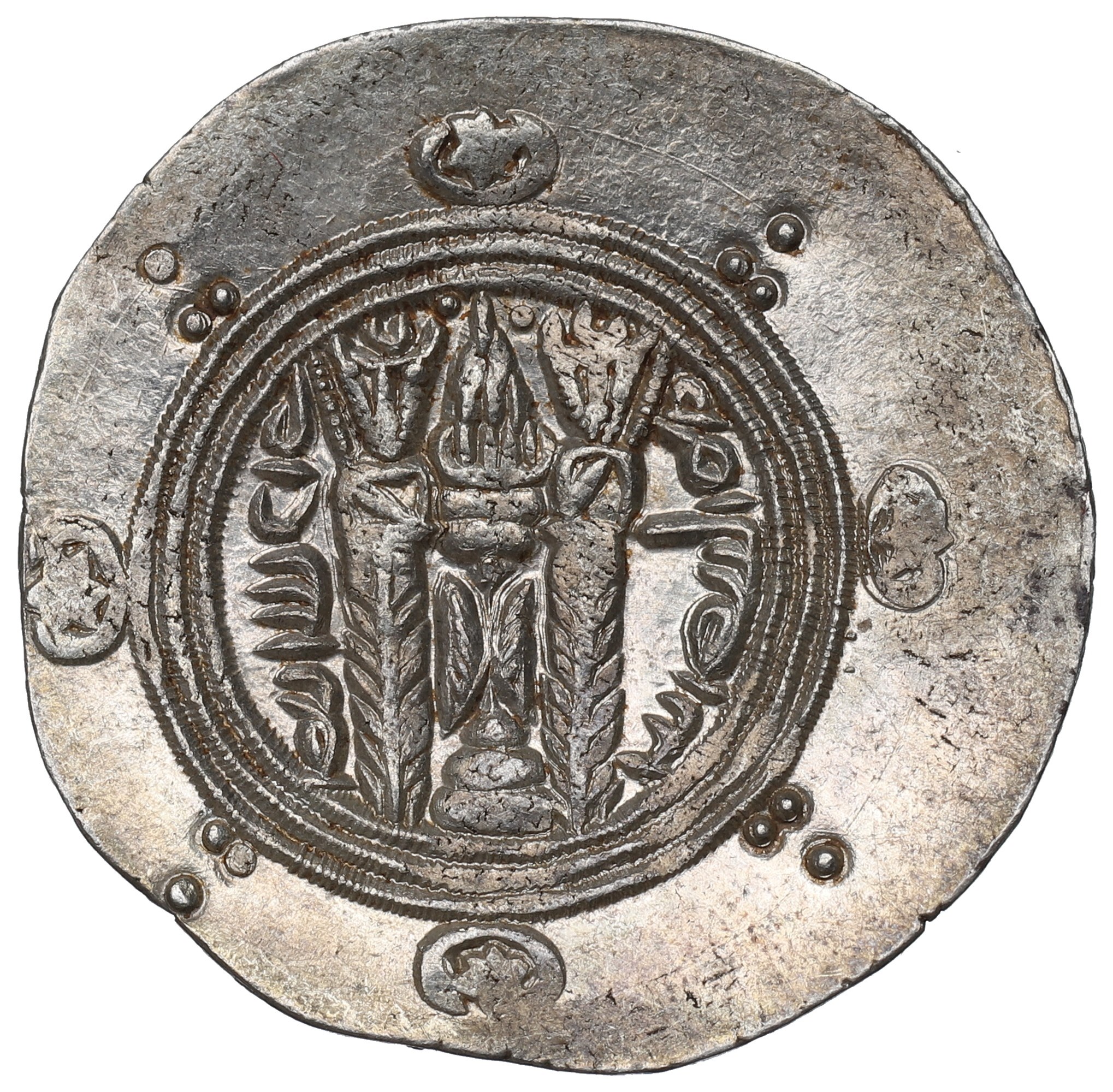 Awers: w podwójnym otoku perełkowym popiersie w prawo, w polach legenda w Pahlavi, poza otokiem legenda w Pahlavi i cztery gwiazdy na półksiężycach;