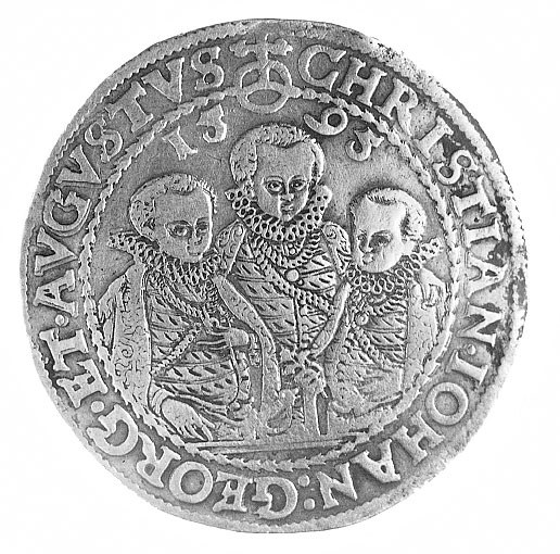 Christian II, Johann Georg I, August 1591-1601, talar 1595, Drezno, Aw: Popiersia trzech książąt, powyżej data i napis w otoku, Rw: Ozdobna wielopolowa tarcza herbowa, w otoku napis, Dav.9820, Merseb.776, Schnee 754