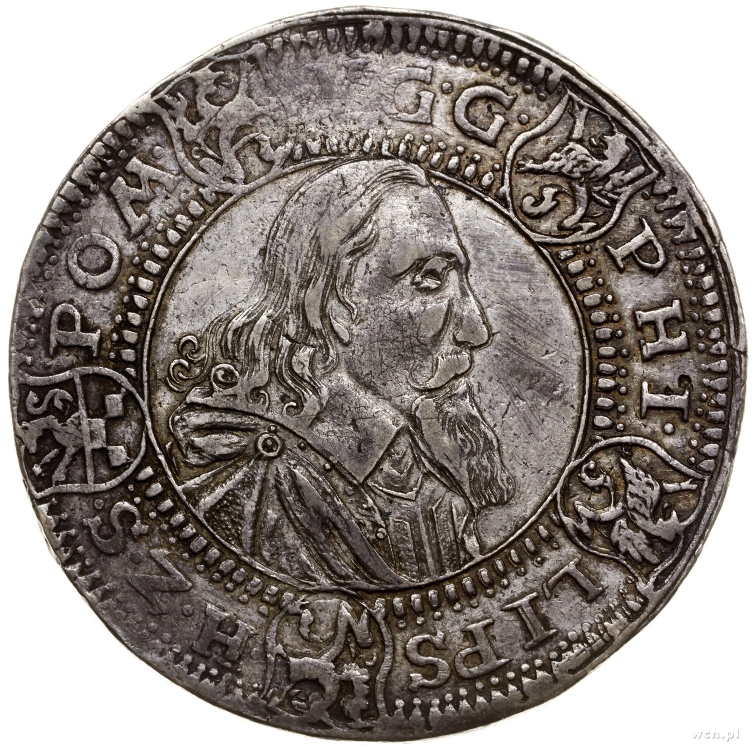 Filip II (1606–1618), Talar, 1613, Szczecin; Aw: Popiersie księcia zwrócone w prawo i napis wokoło V G G - PHI - LIPS - H Z S - POM przerywany herbami; Rw: Gryf z mieczem i księgą, wokoło CHRI - STO ET - REIP - ANNO - 1613 przerywany herbami; Dav. 7205, Hildisch 53, Olding 49, Slg Hahn 1098, Slg Pogge 945; srebro 28.60 g; stara patyna, bardzo rzadki (ex. WCN 33/822, Künker 100/820, UBS 61/451). Talary pomorskie na Pomorzu bito w oparciu o cesarskie regulacje ordynacji menniczej. Ówcześnie ten typ monety bili książęta szczecińscy, jak również książę wołogoski Filip Juliusz, choć niezgodnie z prawem (bite były nielegalnie we Franzburgu). W kraju funkcjonować mogła tylko mennica w Szczecinie. Filip II był wielkim pasjonatem numizmatyki. Już jako władca księstwa nakazał bicie wielu okolicznościowych monet, srebrnych jak i złotych. Najwięcej wybijano złotych guldenów, chociaż nie było na nie faktycznego zapotrzebowania. Przedstawiony talar jest dziełem augsburskiego medaliera i rytownika stempli Daniela Sailera. Rewers monety stanowił nowy symbol państwa i dynastii - gryf z mieczem i księgą w szponach oraz wspólna dla wszystkich typów talarów dewiza księcia CHRISTO ET REIPVBLICAE - „dla Chrystusa i wspólnego dobra”.