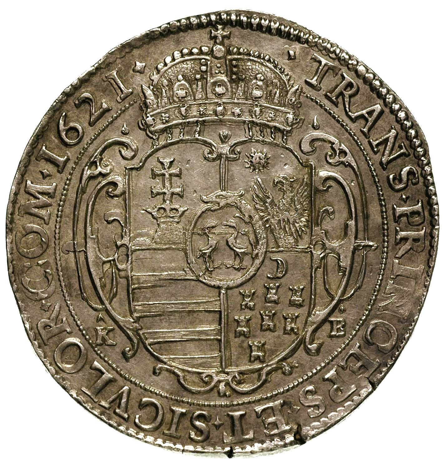Gabriel Bethlen 1613-1629, talar 1621 K-B, Krzemnica, Aw: Półpostać i napis wokoło, Rw: Tarcza herbowa i napis wokoło, 27.75 g, Resch 105, Dav. 4710, bardzo ładny egzemplarz