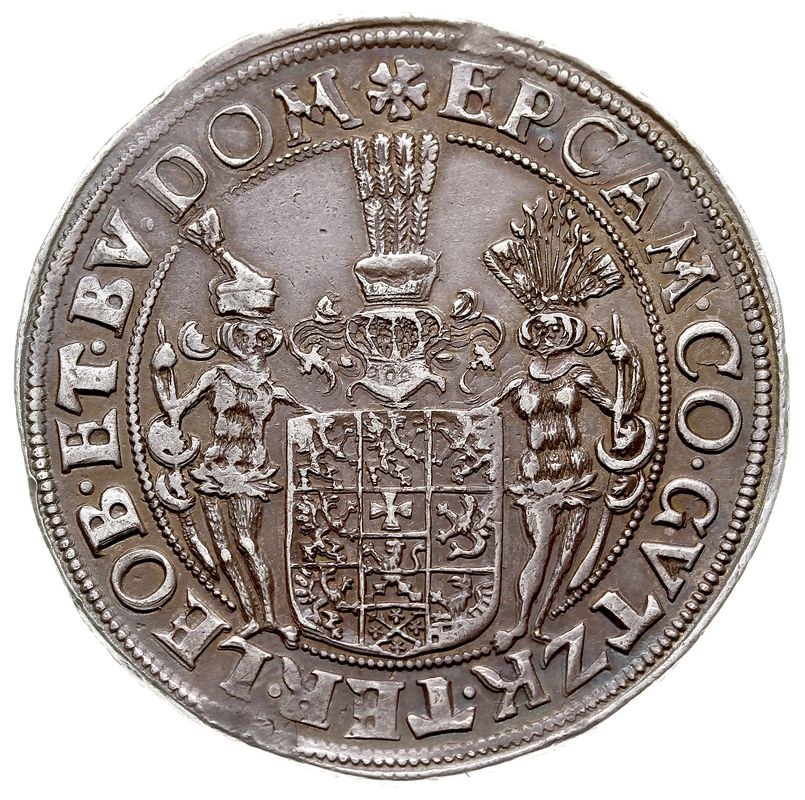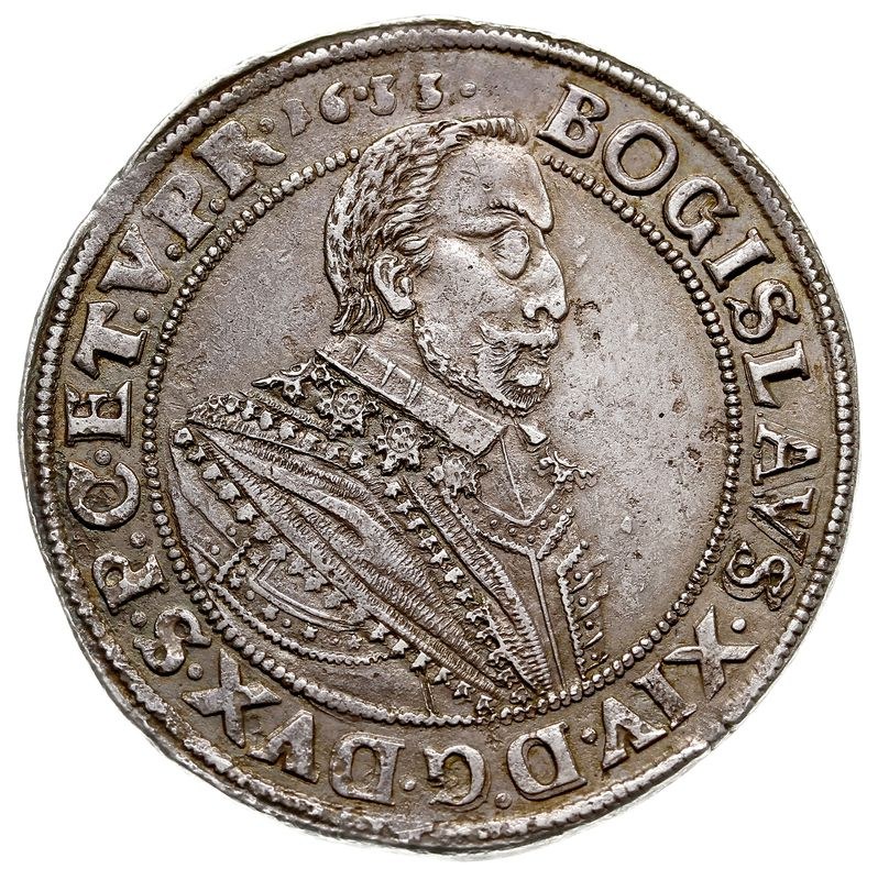 Bogusław XIV (1620)-1625-1637, talar 1633, Szczecin, Aw: Popiersie i napis wokoło BOGISLAVS XIX D G DVX S P C ET V P R i data nad głową księcia, Rw: Tarcza herbowa i napis wokoło EP CAM CO GFTZK TER LEOB ET BV DOM, srebro 28.19 g, moneta z tytułem biskupa kamieńskiego, Hildisch 302, Dav. 7281, moneta z kolekcji Virgila Brand’a sprzedana na aukcji Bank Leu 22.10.1997, poz. 7214, patyna
