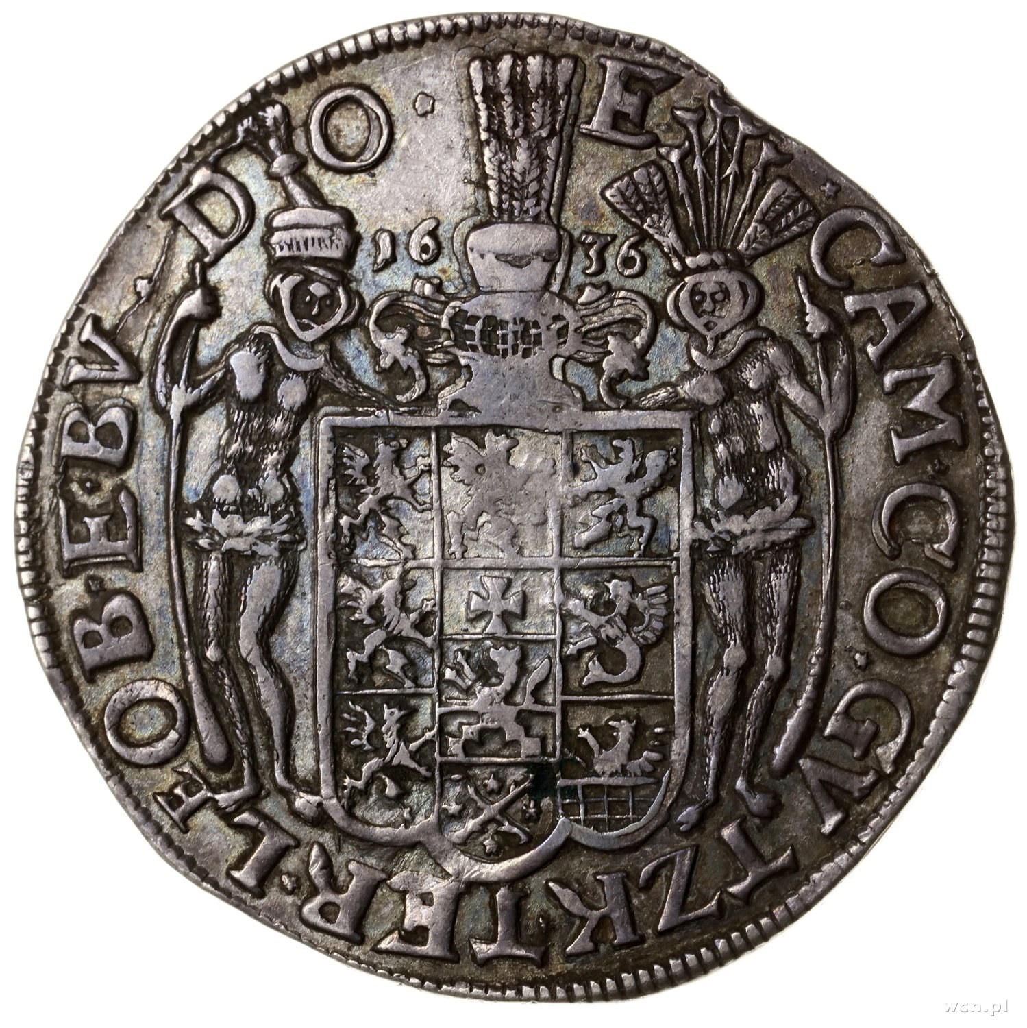 Bogusław XIV (1620–1625–1637), Talar, 1636, Szczecin; Aw: Popiersie księcia zwrócone w prawo, napis wokoło BOGISLAVS XIV D G DVX S P C E V P R; Rw: Tarcza herbowa podtrzymywana przez dwóch ludzi, powyżej rozdzielona data 16-36, napis wokoło CAM CO GV TZK TER LEOB E BV D–O; Dav. 7288, Hildisch 328, Olding 222e, Slg Pogge 1091; srebro 28.81 g; mały uszczerbek na obrzeżu, ciemna, stara patyna, bardzo ładnie zachowany.