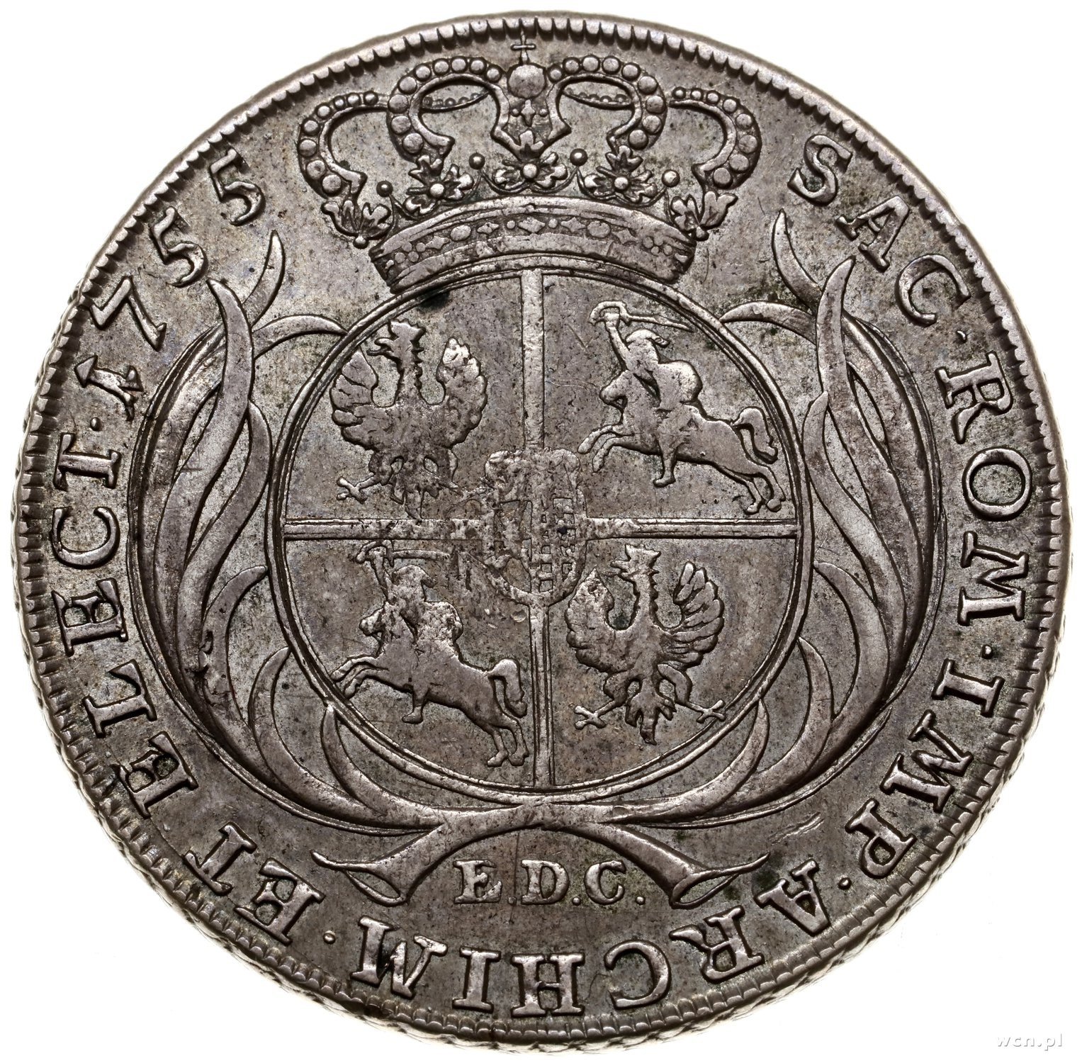 monety polsko-saskie, Talar, 1755 EDC, Lipsk; Aw: Popiersie króla zwrócone w prawo i napis wokoło; Rw: Tarcza herbowa, u dołu inicjały EDC (mincmistrz Ernst Dietrich Croll), napis wokoło; Dav. 1617, Kahnt 676 var. a, Merseb. 1730, Schnee 1037 awers typ B, rewers typ 3, Schön 24.2; srebro 29.06 g; ciemna patyna.