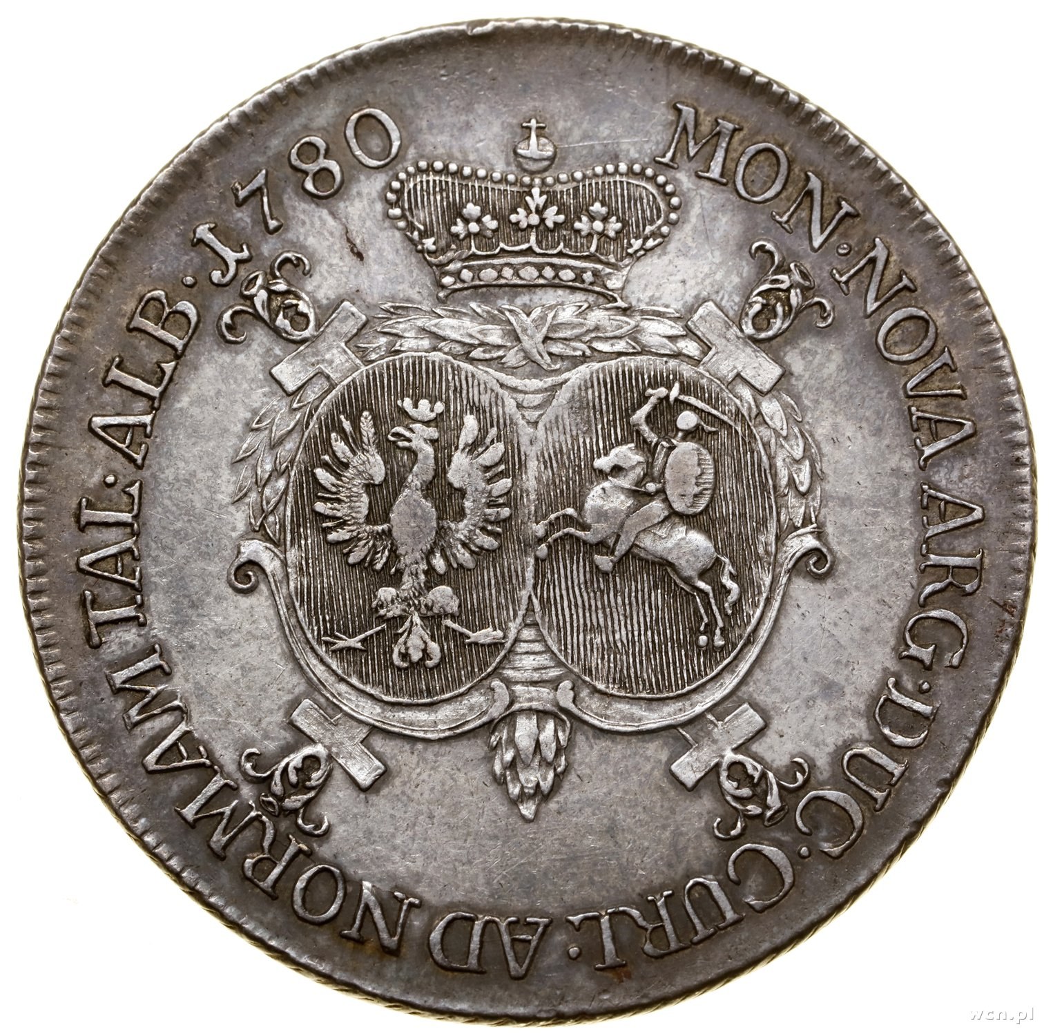 Piotr Biron (1769–1795), Talar, 1780, Mitawa; Aw: Głowa księcia w prawo i legenda wokoło; Rw: Dwie tarcze herbowe pod koroną i legenda wokoło; Davenport 1624, H-Cz. 3410, K.-G. 7.1.1.1, Kop. 4104 (R2); srebro, 28.22 g; stara patyna.