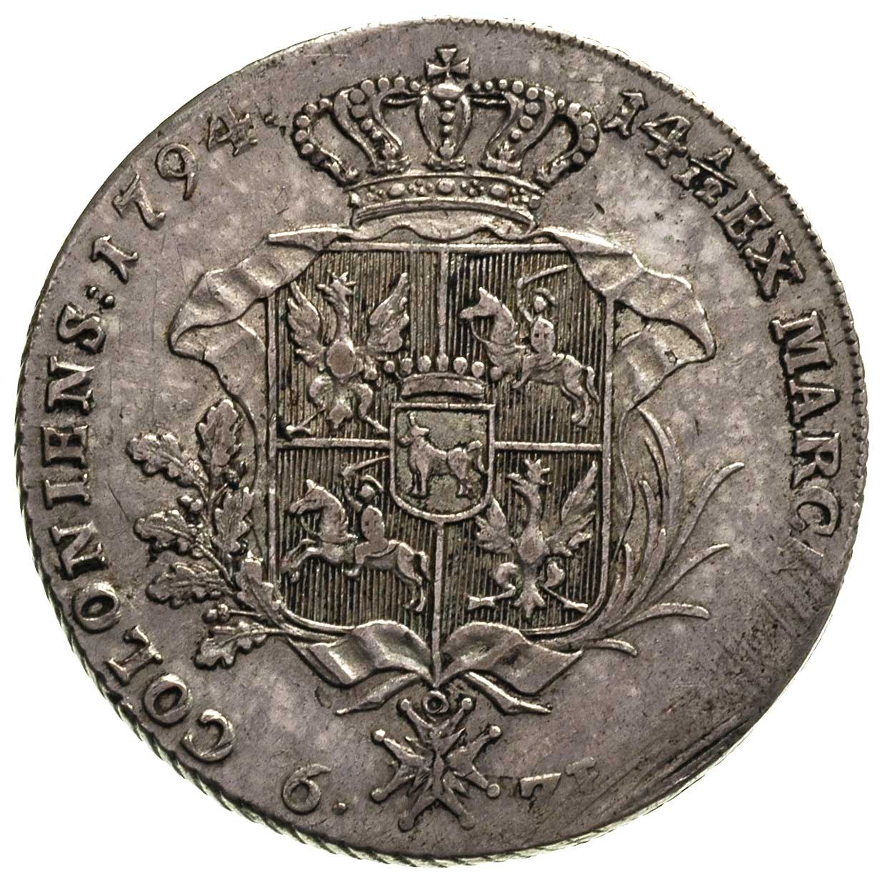 Stanisław August Poniatowski 1764-1795, talar 1794, Warszawa, odmiana z nieco dłuższym wieńcem, Plage 373, Dav. 1623, justowany, patyna, ładnie zachowane lustro mennicze rzadko spotykane w talarach 6 złotowych