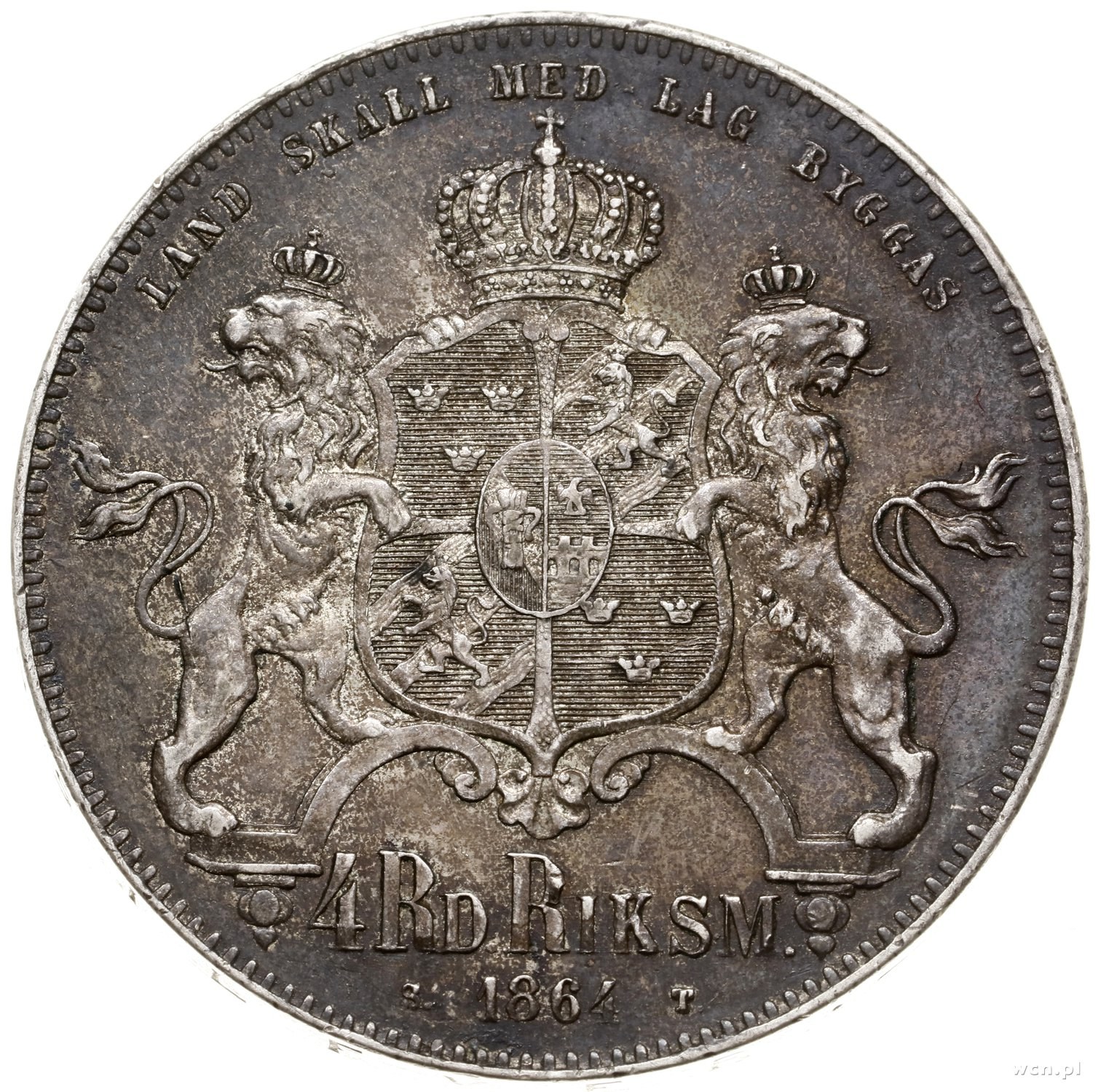 Karol XV (1859–1872), Talar (4 Riksdaler riksmynt), 1864, mennica Sztokhom; SM 17; srebro, 33.98 g; ładnie zachowana moneta, w ciemnej patynie.