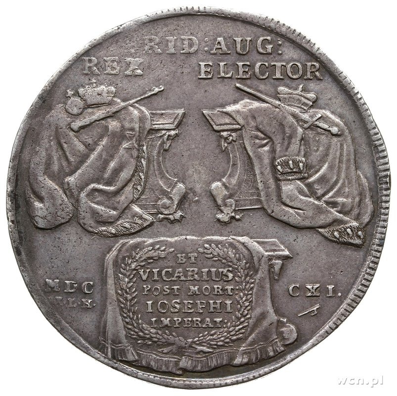 monety pamiątkowe, talar wikariacki 1711, Drezno; Aw: Król na koniu; Rw: Trzy stoły z insygniami koronacyjnymi i napisy; Kahnt 283, Schnee 1011, Dav. 2655, Merseburger 1490; srebro 29.14 g; bardzo ładnie zachowany.