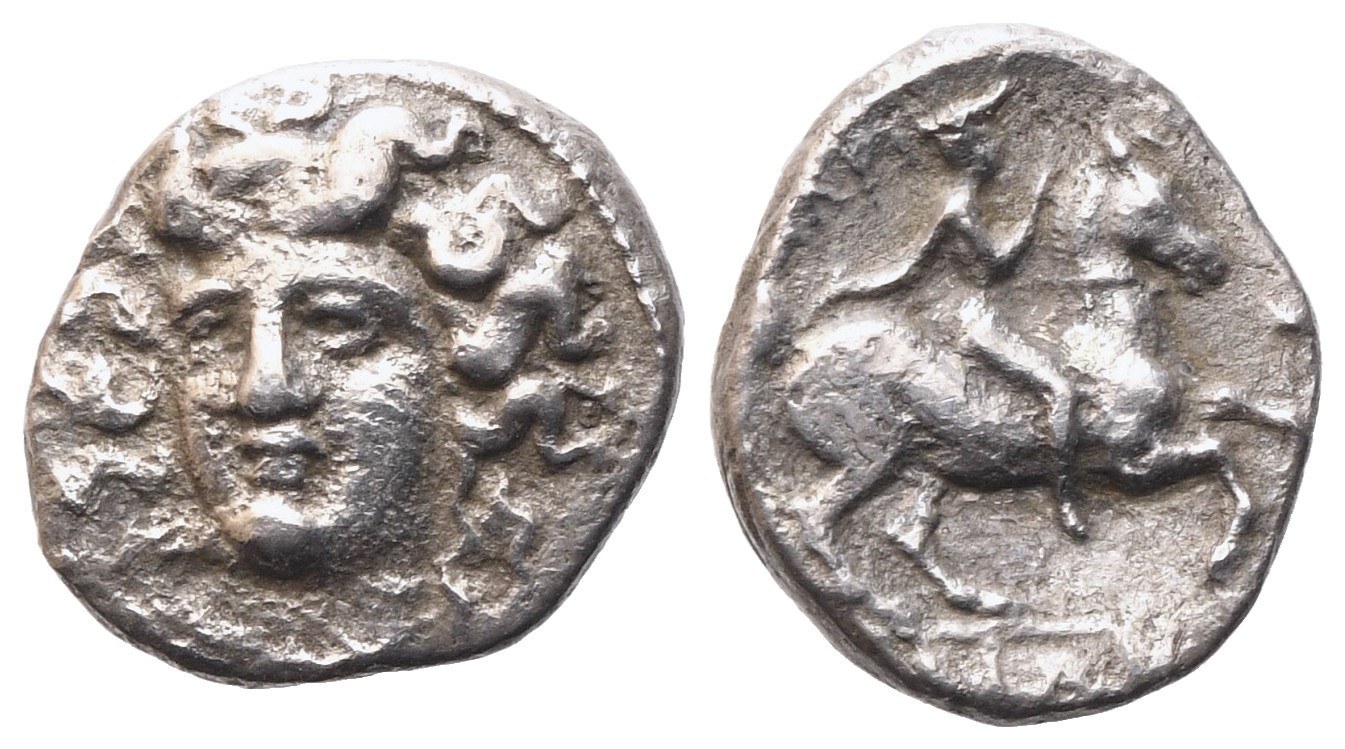Head of the nymph Larissa facing, turned slightly to l.; Rv. Horseman riding r. Hermann Group VI, pl. VI, 1; SNG Cop. 134. Very fine.