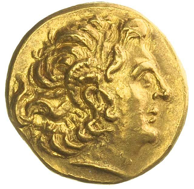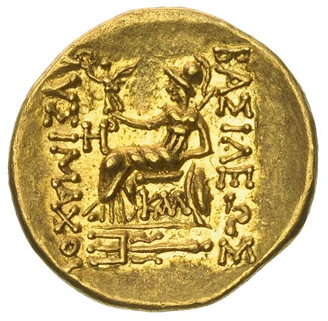 GRECJA, TRACJA, Lizymach 323-281 pne, stater mennica Kallatos, Aw: Głowa Aleksandra w diademie z rogami Ammona w prawo, Rw; Atena z Nike w dłoni siedząca w lewo, pod tronem monogram, niżej trójząb, napis po bokach, Szaivert-Sear 6989, złoto 8.35 g, ładny egzemplarz