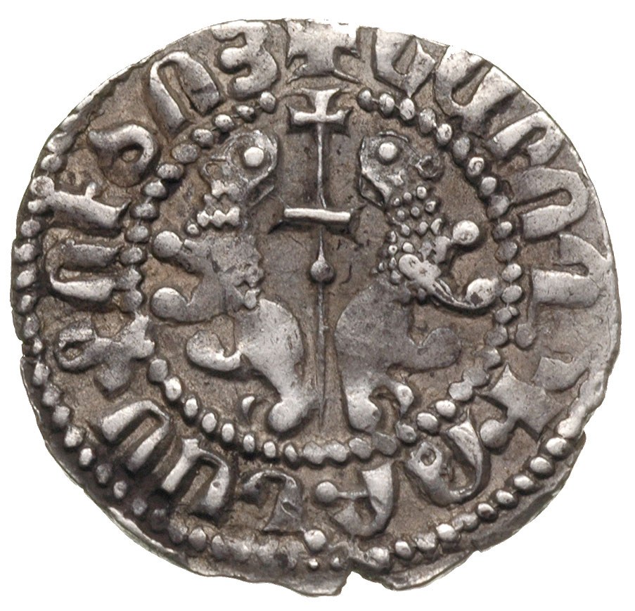 Lewon I 1198-1219, tram, Aw: Król na tronie z krzyżem i kwiatem lilii w dłoniach, w otoku napis, Rw: Długi krzyż pomiędzy dwoma lwami i napis w otoku, srebro 2,87 g, Nercessian 292, patyna