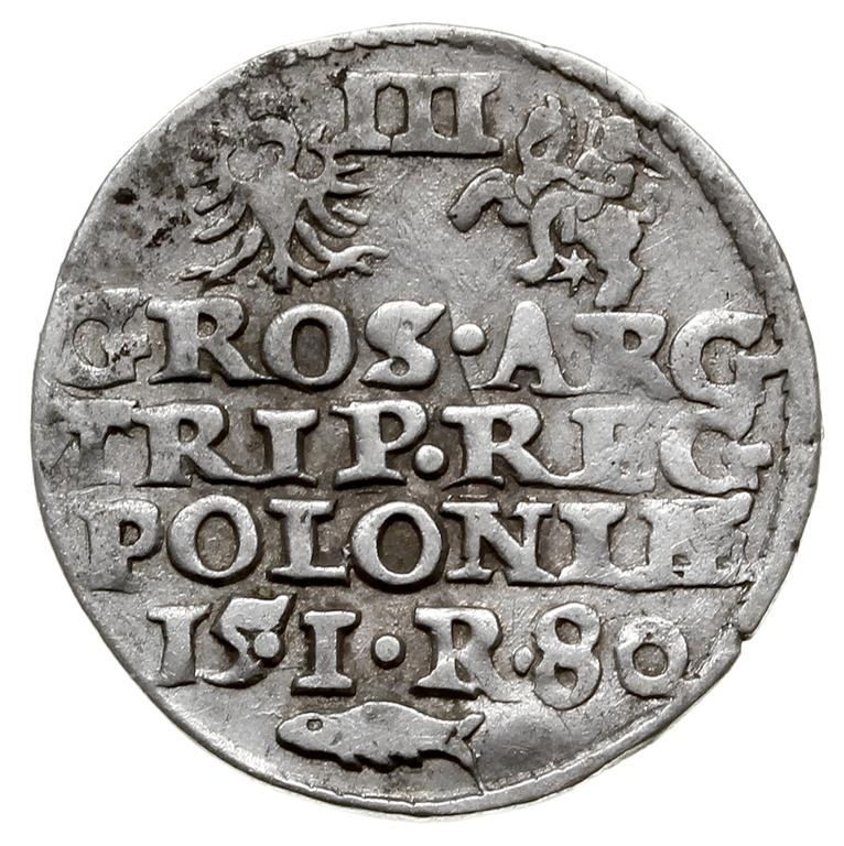 Stefan Batory 1576-1586, trojak 1580, Olkusz, Aw: Popiersie króla w prawo i napis STEPHAN D G - REX POLO, Rw: Nominał, herby Polski oraz Litwy i napis w trzech wierszach GROS ARG / TRIP REG / POLONIAE / 15 I R 80, herb Glaubicz (Ryba) na awersie i rewersie, Iger O.80.16.a (R8), T. 80, moneta wielkiej rzadkości
