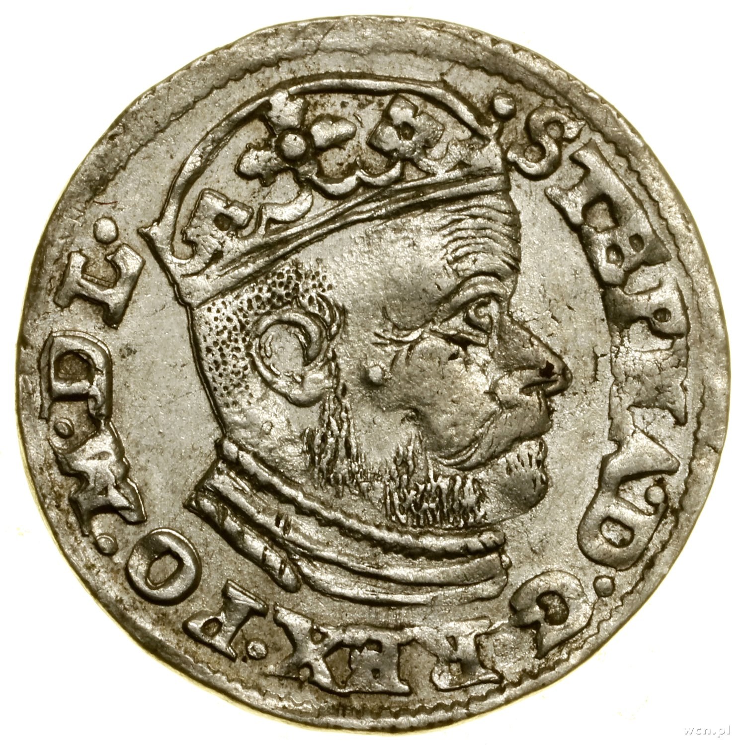 monety koronne, Trojak, 1585, Olkusz; wariant z inicjałami N - H (Mikołaj Hevel de Colpino, zarządca mennicy), przy Orle i Pogoni, kropka pomiędzy D G w legendzie awersu; Iger O.85.3.a (R1), Kurp. (1576–86) 185 (R1), Parchimowicz Trojaki 80.a; bardzo ładny.