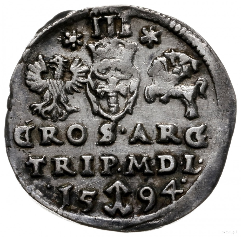 mennica wileńska, trojak 1594, Wilno; SG III D G-REX PO M D L; Iger V.94.1 - nie notuje tej odmiany napisowej, Ivanauskas - nie notuje