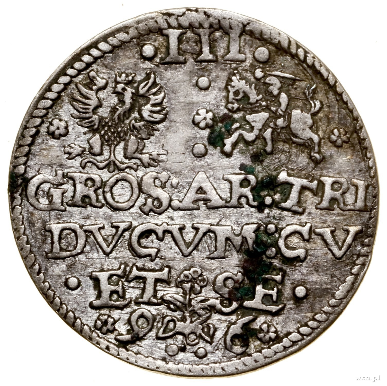Fryderyk Kettler (1587–1642), Trojak, 1596, Mitawa; data na dole rozdzielona znakiem mincerskim podskarbiego kurlandzkiego Krzysztofa Pipenstocka; Haljak 1660, Iger KuF.96.3.c (R4), K.-G. 2.10.6.1, Kop. 4028 (R5); miejscowo grynszpan na rewersie, rzadka i dość ładnie zachowana moneta.