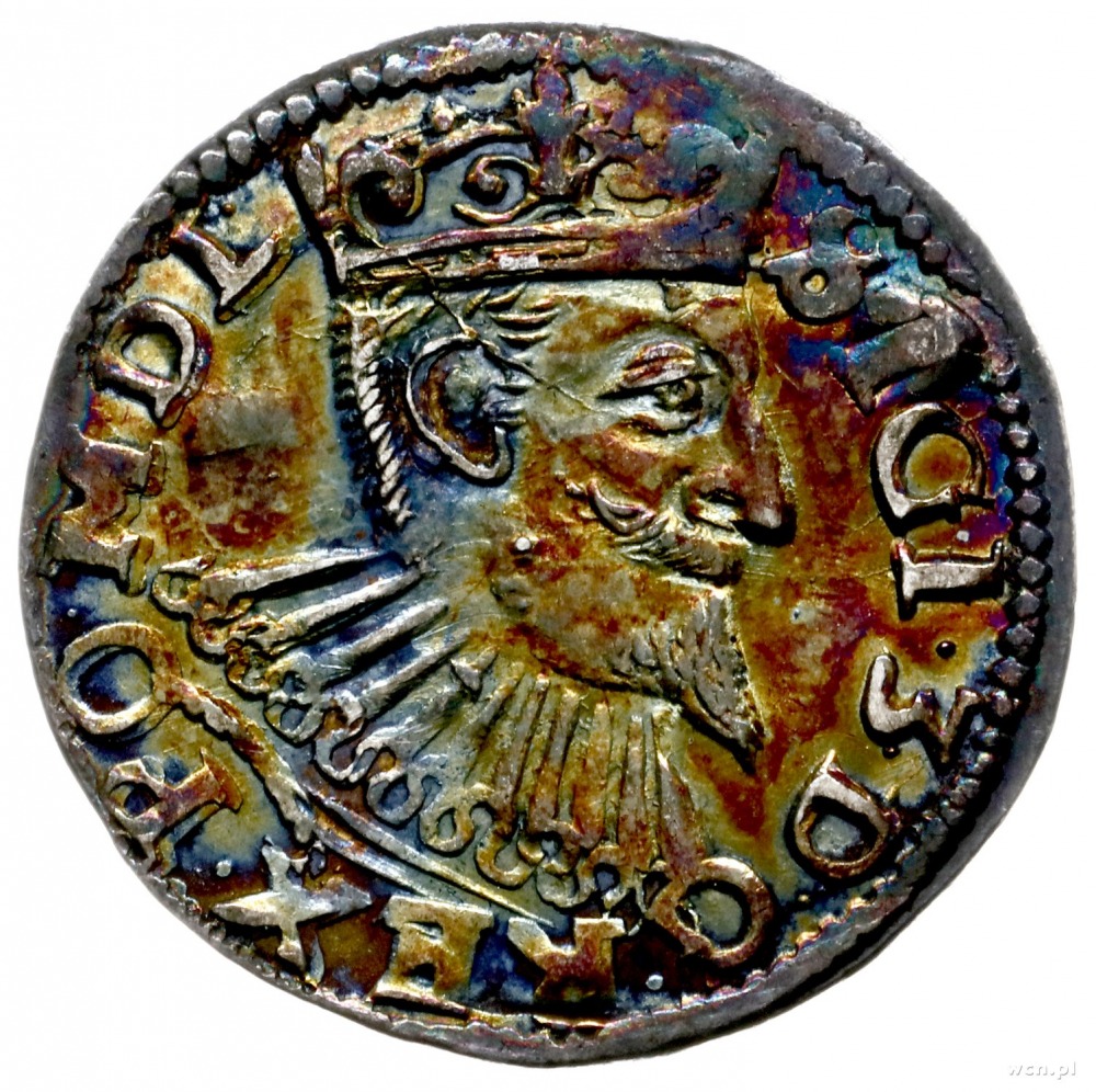 monety koronne, trojak 1596, Poznań; na awersie z końcówką M D L; Iger P.96.4.a; kolorowa patyna