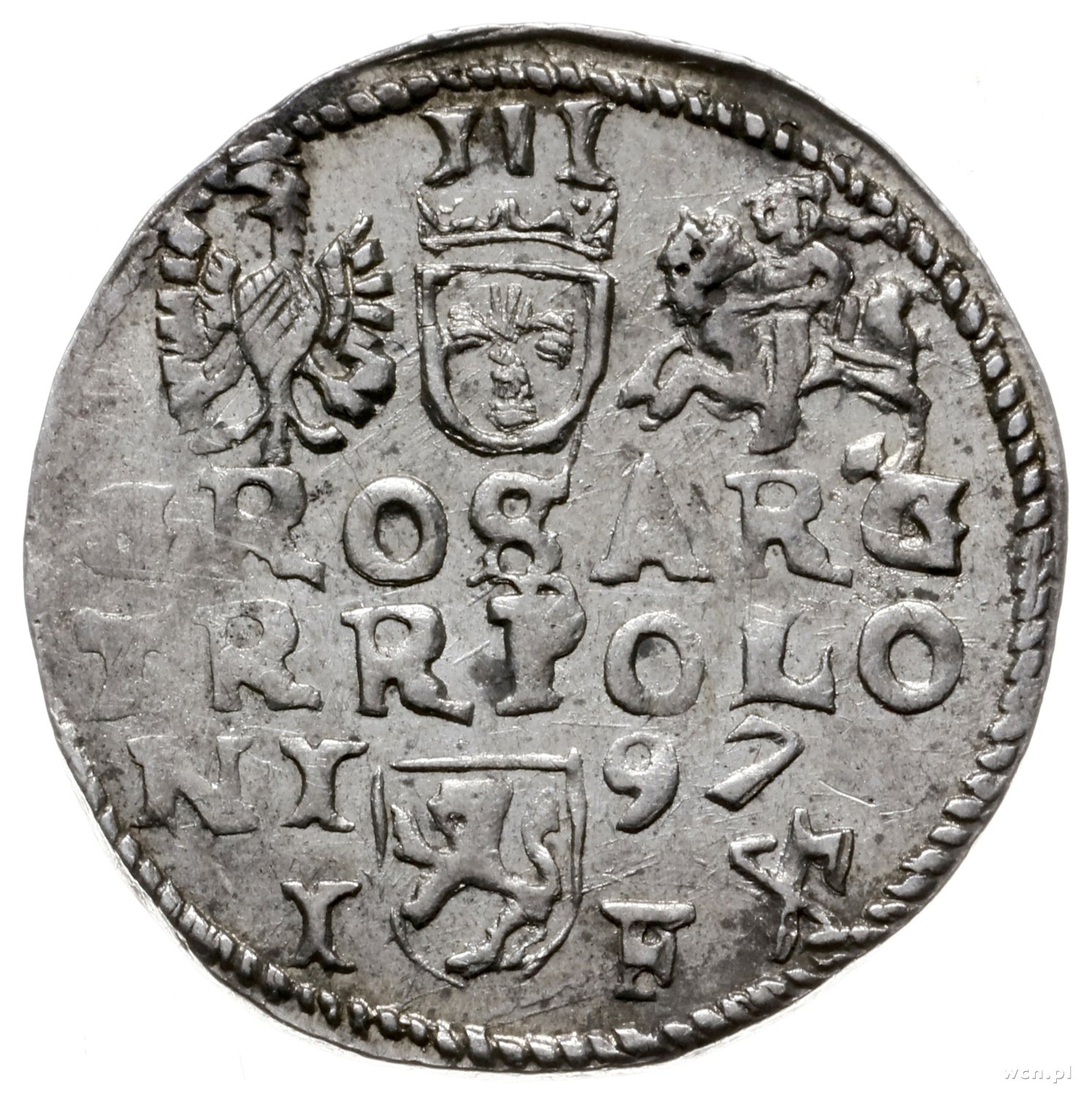 monety koronne, trojak 1597, Lublin; na awersie przerwa między RE-X i końcówka PO M D L, odmiana ze znakiem mincerskim (Hansa Ecke) i skróconą datą z prawej strony herbu Lewart; Iger L.97.19- nie notuje takiego wariantu (wariant awersu jak L.97.18); bardzo ładny i ekstremalnie rzadki