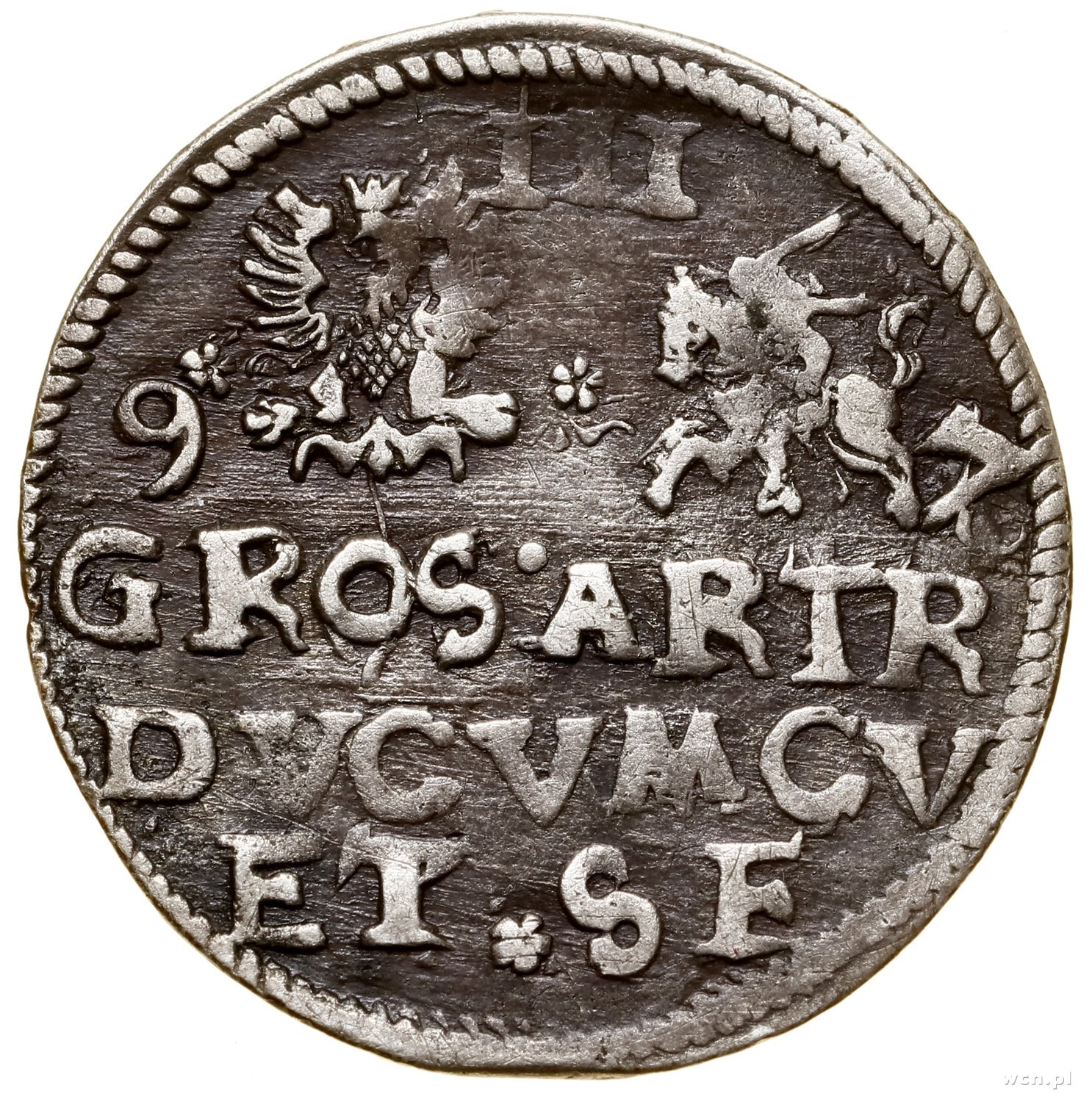 Fryderyk Kettler (1587–1642), Trojak, 1597, Mitawa; przebita data z roku 1596 na górze po bokach Orła i Pogoni; Haljak 1663, Iger nie notuje (podobny do KuF.96.1.a), K.-G. 2.11.1.1, Kop. 4034 (R5); stara, ciemna patyna, bardzo rzadki.