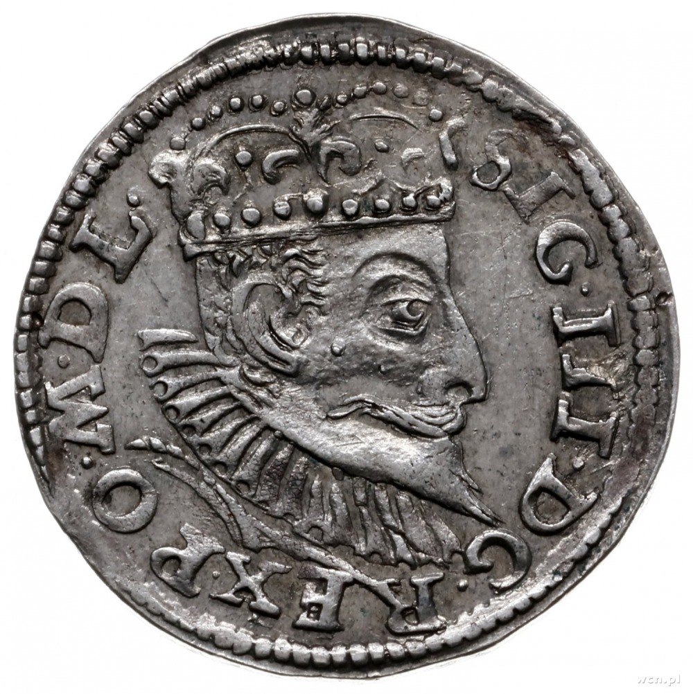 mennica poznańska, trojak 1597, Poznań; u dołu rewersu skrócona data rozdzielona kwiatkiem trójlistnym, na rewersie napis w trzech wierszach, popiersie z małą wachlarzowatą kryzą; Iger P.97.4.b; ładny