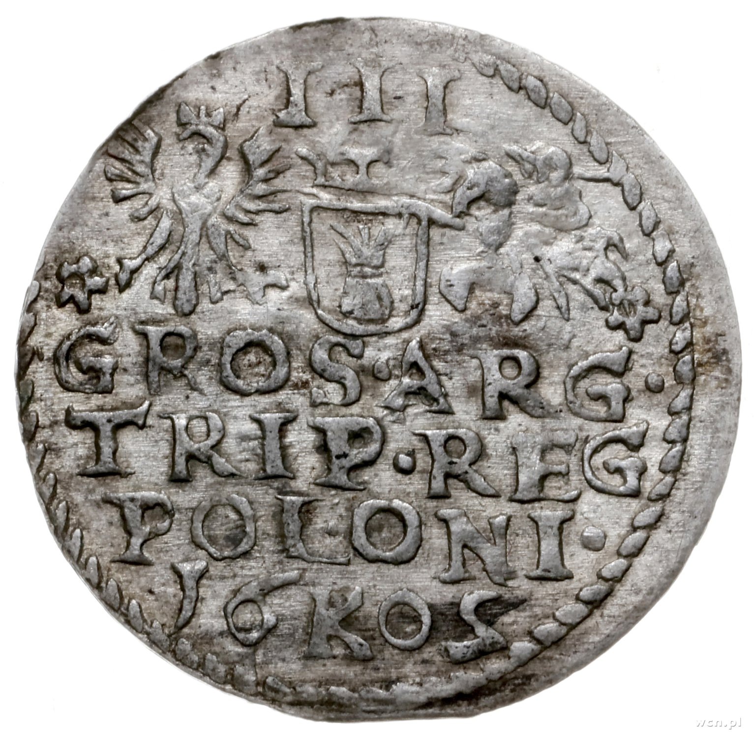 monety koronne, trojak anomalny 1605; nietypowe popiersie króla niewystępujące w typach krakowskich, na rewersie 16K05 z odwróconą cyfrą 5, kropka między POL.ONI; Iger - nie notuje; bardzo ładny i efektowny