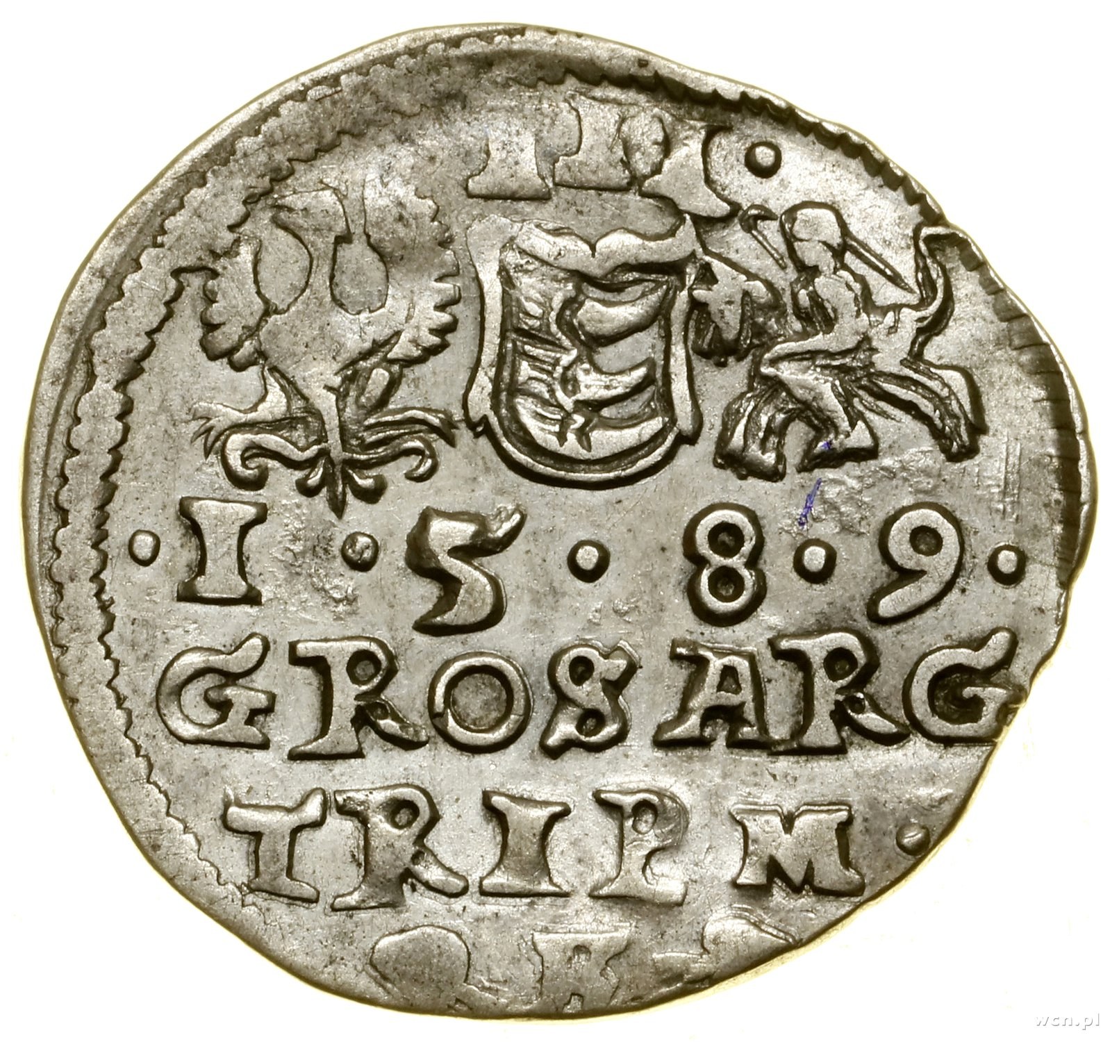 monety litewskie, Trojak - naśladownictwo z epoki, “1589”, stylizowany na egzemplarz z mennicy wileńskiej; Aw: Popiersie władcy w prawo, STEPA D G REX POL; Rw: Orzeł, Pogoń i herb Batorych, poniżej data (cyfry przedzielone kropkami), GROS ARG TRIP M, poniżej dwa liście i litera K(?) pomiędzy nimi; ciekawa moneta wykonana w poprawnym stylu, podobna do monet wybijanych w mennicy w Wilnie, jednak data niepoprawna – król zmarł w 1586 roku.
